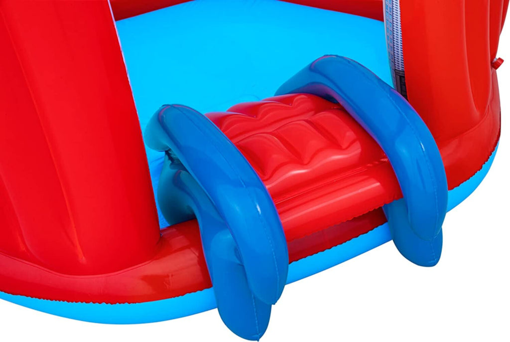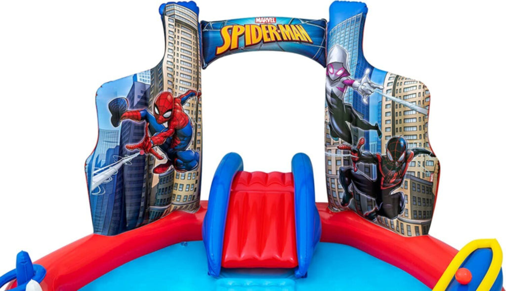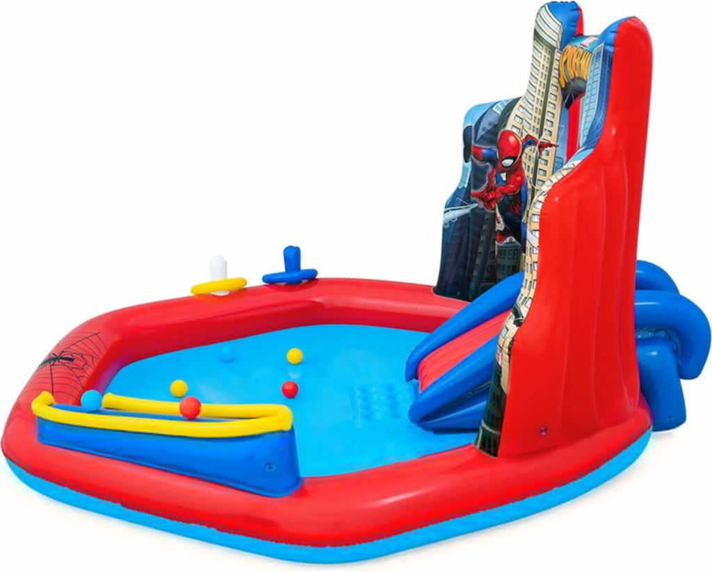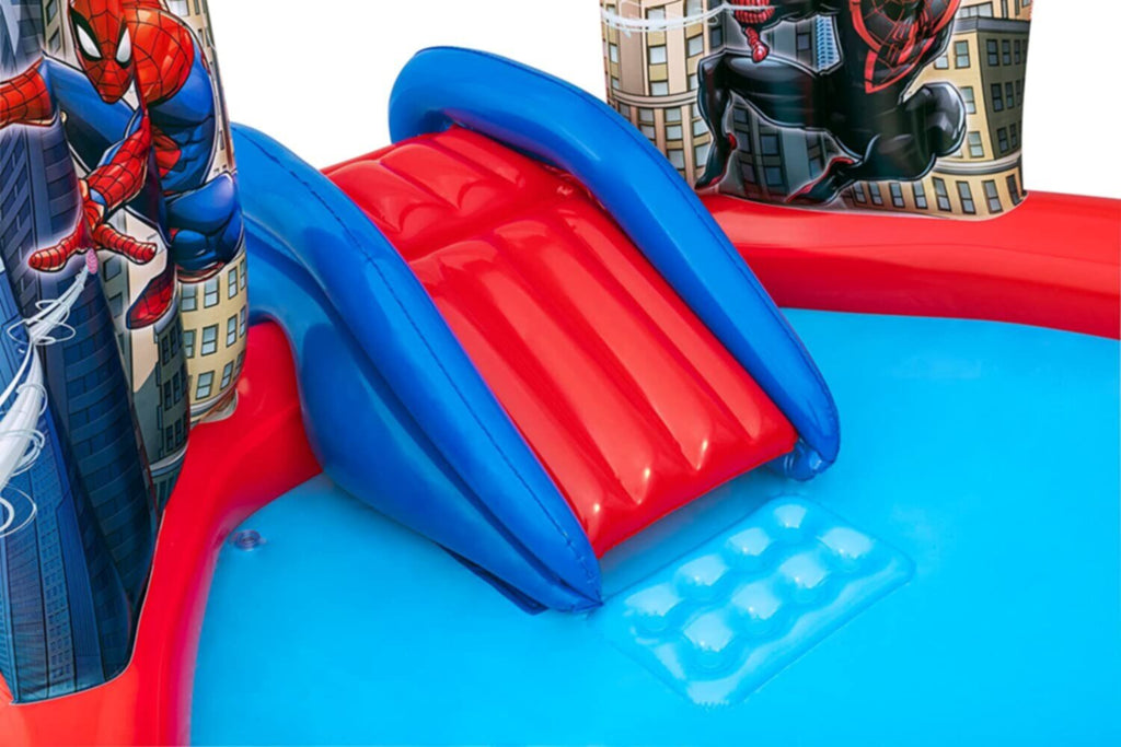Spider-Manâ„¢, the popular superhero, is ready to get into action with the water play centre! Simply inflate it effortlessly and fill the pool with up to 165 litres of water, connect a garden hose (not included) to the arc to activate the sprayer and the adventure can begin. With the slide integrated into the bottom, kids can enjoy exuberant fun in the sun. Watch your kids put their dexterity to the test by throwing the two colourful rings. Or they can take turns rolling 6 play balls down the ramp to test their speed and agility. When bath time is over, drain the water using the integrated drain valve. The water play centre can operate with or without water and offers fun and excitement all year round. The friendly neighbourhood spider is ready for anything!