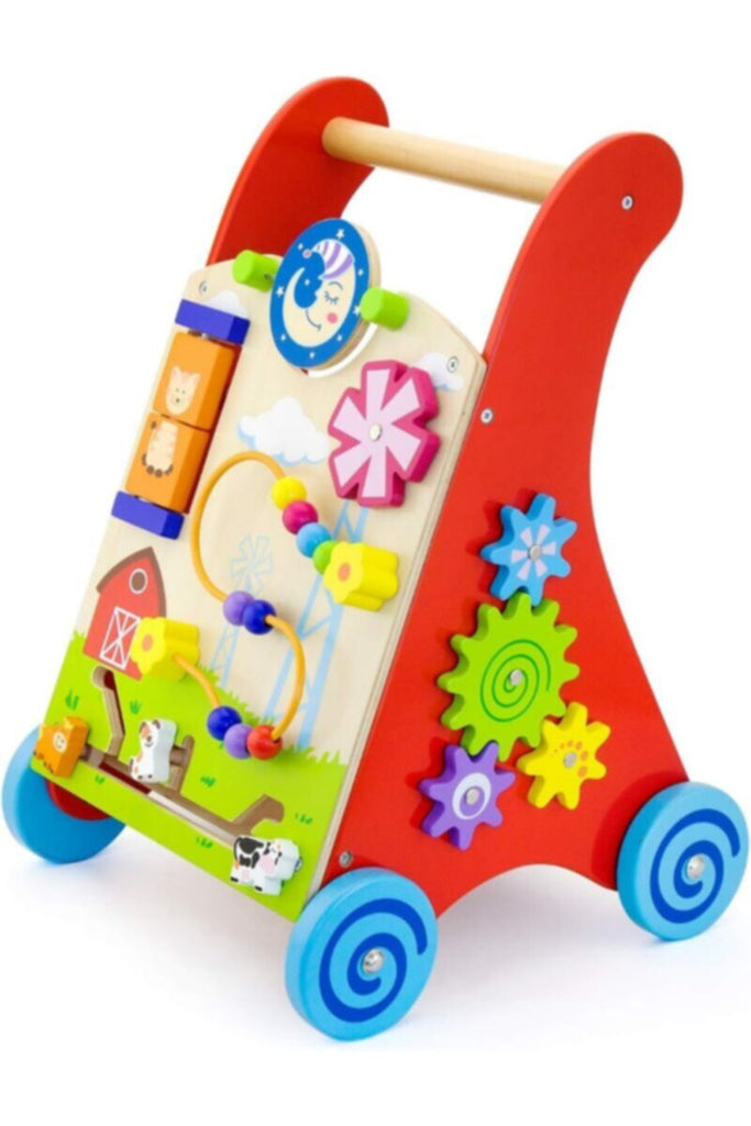 This wooden baby walker is combined with various activity toys including, farm animal track and trace, wire beads, turntable windmill, sun/moon turning plate on the front, with gears and track and trace blocks on the sides. A strong and sturdy walker is ideal for new walkers. Natural, Safe, Educational and Fun are the label of VIGA toys. Nbsp;About VIGA Toys: Natural, safe, educational and beautiful, are the features of VIGA Toys. All products have an attractive design. New products are regularly developed. With more than 20 years of experience, VIGA knows how to produce top-quality toys.