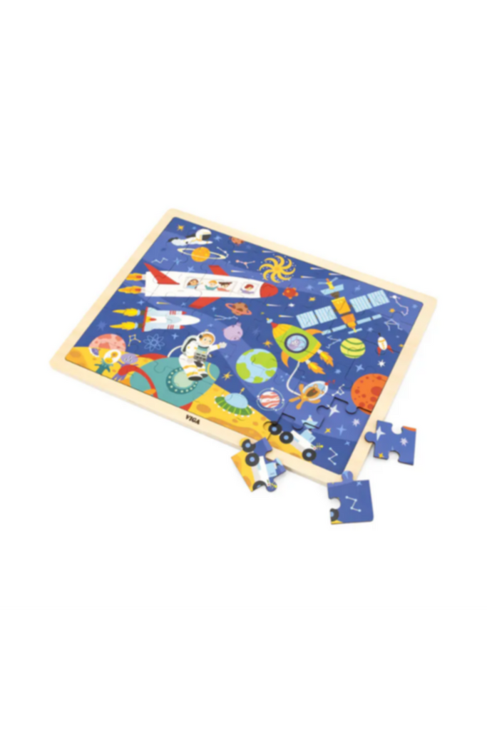 Viga Wooden Puzzle Space a wooden storage tray, match up the numbers or the image underneath helping little ones make their puzzle. After finishing the puzzle, guide children to describe the picture to you with their imagination, encouraging children to talk more while playing. The educational puzzle helps children develop strong hand-eye coordination, fine motor skills and problem-solving ability as well. Suitable for 3 years children. Package contains of 48 pieces.