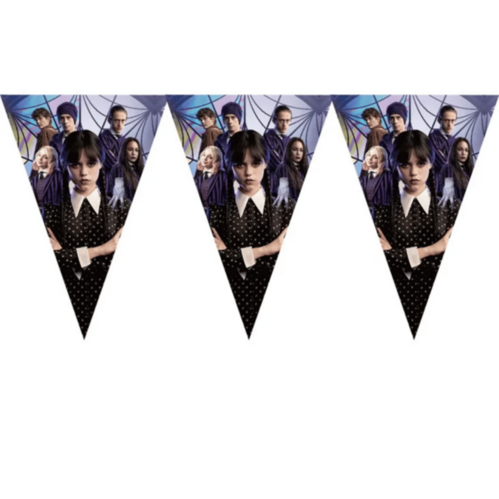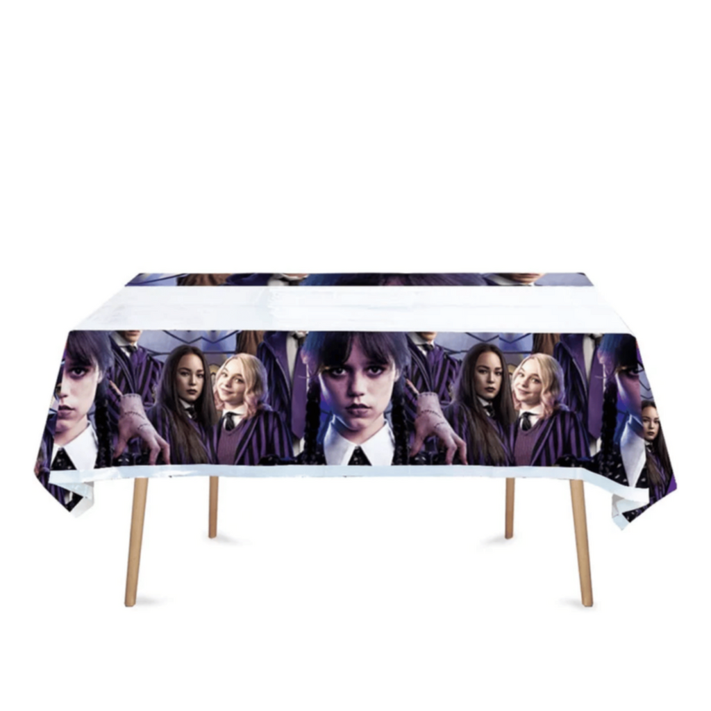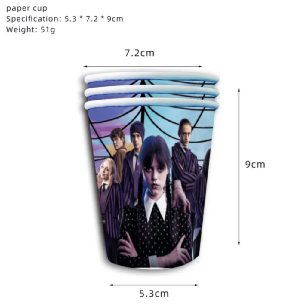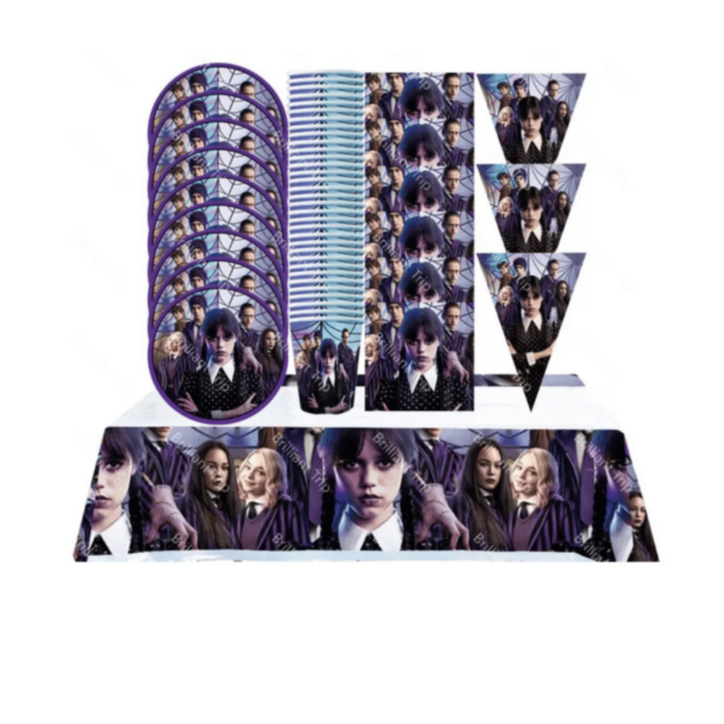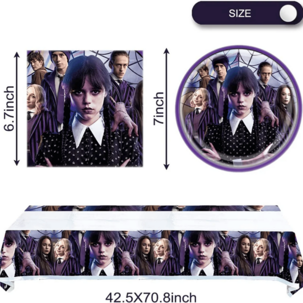 â—† Wednesday birthday party set includes: 20 Pcs x 7'' Wednesday Themed Dessert Plates, 20 Pcs x Napkins, 20 Pcs x Party Cups, 1 Pcs x Tablecloth, 1 Set x Banner