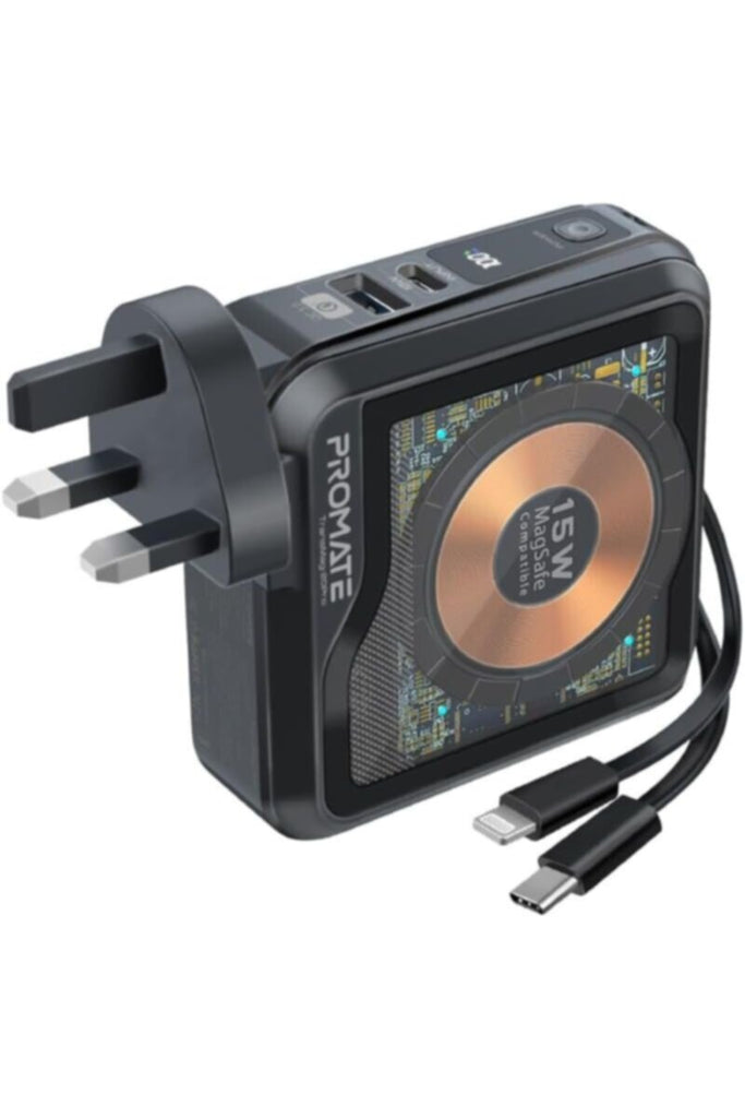 TransMag-20Pro is the ideal combination of a unique transparent design and ultra-fast charging technology, that makes for a superior, one-of-a-kind charging experience on the go. TransMag-20Pro features a 15W MagSafe-compatible charging module that perfectly aligns with the new iPhone series for super-fast charging. There is no need for you to carry extra cables as TransMag-20Pro features built-in USB-C and Lightning Connector cables. The AC input lets you charge the power bank quickly through an AC socket and also use it as a wall charger. TransMag-20Pro also boasts a USB Quick Charge 3.0 port that provides a stunning 22.5W power output. Simplify your on-the-go charging experience with this versatile 10000mAh power bank. â—† Built-In Cables: Forget the hassle of carrying extra cables as TransMag-20Pro features built-in USB-C and Lightning Connector cables. With the premium TransMag-20Pro, enjoy an effortless and unique charging experience. â—† Powerful Backup Battery: TransMag-20Pro boasts a powerful 10000mAh li-polymer backup battery, so you can keep your devices powered up, anywhere, anytime. Save time on the charging speed with this super-efficient, power-packed, portable charger. â—† 15W MagSafe Compatible Charging: TransMag-20Pro magnetic wireless charger aligns with your smartphone and charges your wireless charging compatible devices at 15W ultra-fast speeds. â—† Quick Charge 3.0: This ultra-fast power bank also boasts a USB Quick Charge 3.0 port that provides 22.5W ultimate fast charge for compatible devices. Featuring rapid charging technology, this power bank offers superior performance faster than any other conventional charger. â—† Charge 4 Devices: Simultaneously charge up to 4 devices through the MagSafe compatible wireless charging pad, dedicated QC 3.0 USB-A port, and the built-in USB-C and Lightning Connector cables. Now, enjoy sharing power with your families/friends and with your number of power-hungry devices. â—† Automatic Voltage Regulation: TransMag-20Pro features Automatic Voltage regulation that offers the optimum charge to your connected devices. It makes sure devices get maximum power in the safest environment. â—† Multi Protect System: TransMag-20Pro ensures safe and dependable charging, as it features over-charging and high-voltage protection. Enjoy safe and reliable charging with complete all-around protection for your devices. â—† AC/DC Charging Input: Through the AC/DC charging input you can charge your TransMag-20Pro power bank easily and also use it as a wall charger. You can also simply use the USB-C input if you find easier to use. â—† Transparent Design: TransMag-20Pro has a transparent design with a touch of style and uniqueness to give you a one-of-a-kind charging experience. The clear tempered glass |