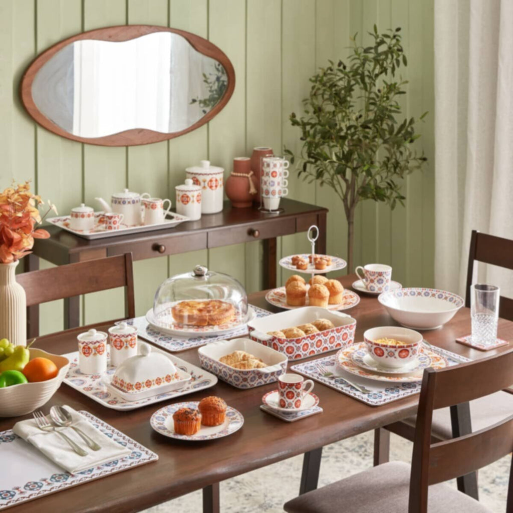 The Majestic collection exudes a design inspired by all that is Moroccan, with refinement to offer modern and simplistic elements. The design has its roots from old caftan rugs and textiles which are rich and vibrant in colour. These textile patterns have translated very well to achieve the new stunning design. This creamer is a stylish pick for your tea collection. Made from bone China, this piece boasts a curved handle and a printed detailing. Ideal for serving milk, this food-safe creamer will look attractive when placed on your dining table.The product images have props used for illustrative purposes.