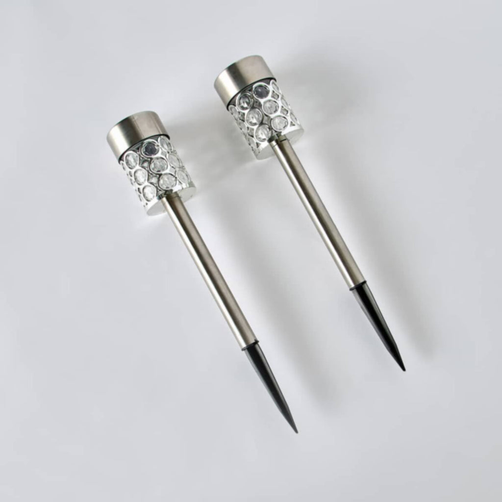 Illuminate your outdoor space with this set of two solar-powered spike lights. Each light features a modern design with a sleek aluminium finish. They are perfect for adding a touch of light and style to your garden, patio, or driveway.The product images have props used for illustrative purposes.