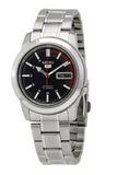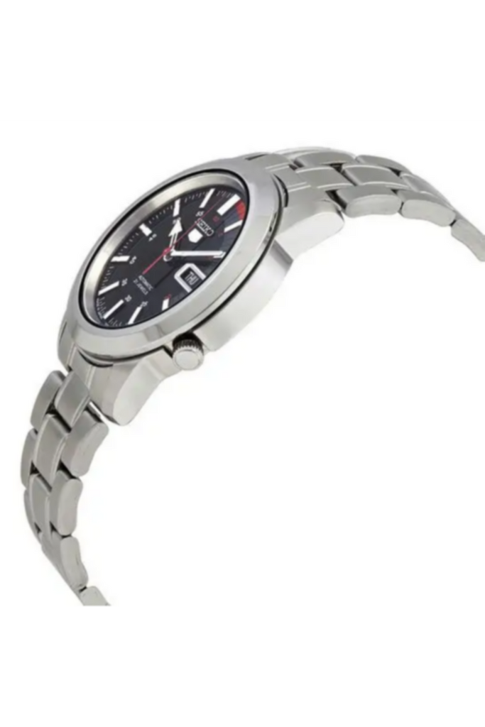 â—† Seiko is a 38mm men's automatic watch with a stainless steel case and a black-red analog dial protected by hardlex crystal.