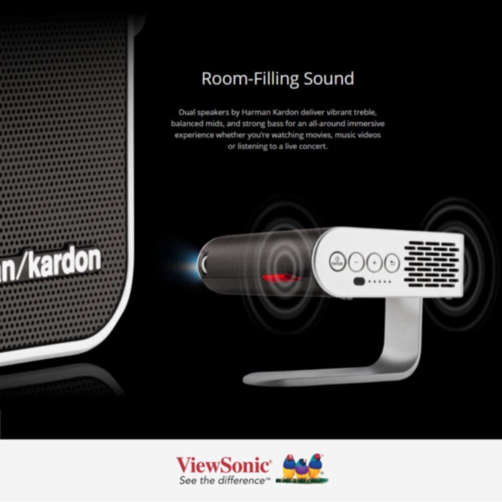 The ViewSonic M1+_G2 is an iF award-winning, ultra-portable LED projector that can deliver a convenient, enjoyable entertainment experience anywhere it goes. With a built-in battery, a LED light source with up to 30,000 hours of lifespan, all packaged into less than 1 kg, the M1+_G2 can deliver years of multimedia entertainment wherever it goes – from room to room, both inside and outdoors. Its smart stand enables simple 360-degree setup, while doubling as a lens cover. Once the lens is uncovered, the projector automatically powers on to full brightness for instant entertainment. Stereo Harman Kardon speakers provide room-filling sound for an amplified experience, while more flexible audio needs can be realized via Bluetooth. Integrated Wi-Fi connectivity makes streaming easier than ever – both wireless casting from smart devices and built-in content streaming are possible.