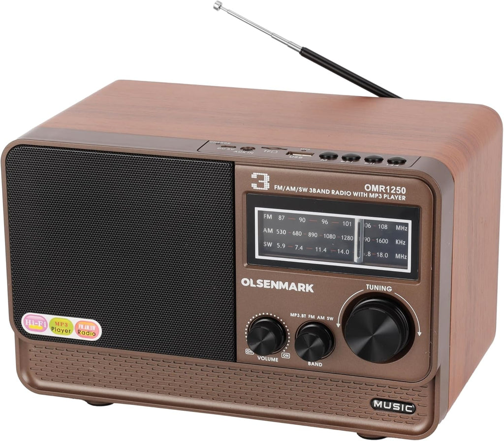 Compact in size and clear in sound. Enjoy your free time by tuning on the MP3 player-equipped Olsenmark rechargeable radio and listening to your favorite music. The radio has been designed in a stylish black and brown color in a rustic and classic design. The radio has versatile functions, which rank it highly. The functions include MP3 player, USB, TF function, FM/AW/SW 3 bands, Bluetooth rechargeable battery, etc. You can easily tune in to any local radio station using a simple yet easy-to-use knob.