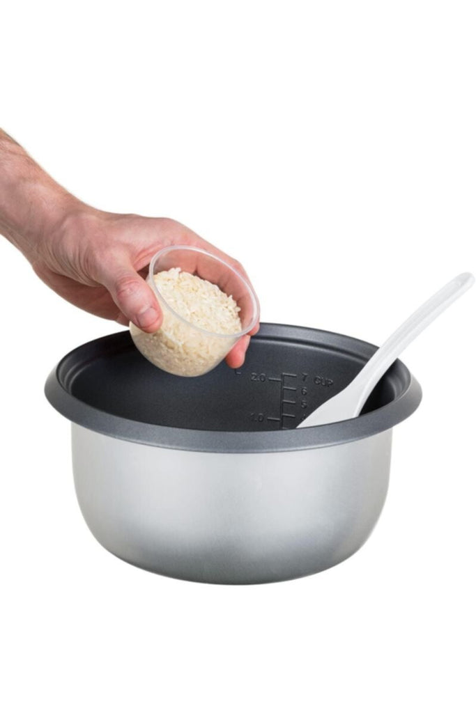• سلة تبخير، كوب قياس وملعقة مرفقة. استخدم كوب القياس العملي لاختيار الكمية الدقيقة من الأرز التي ترغب في طهيها. وبمجرد أن يصبح الأرز جاهزًا،