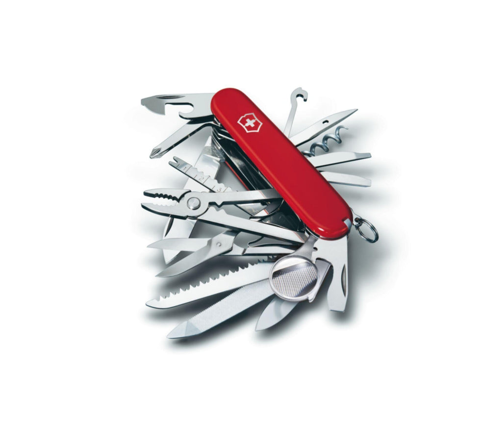 عند سماع عبارة "سكين الجيش السويسري"، يتبادر إلى ذهنك غالبًا سكين الضابط الأسطوري. وتستمر هذه الأسطورة مع سكين الجيب "سويس تشامب". إنها سكين الجيب المثالية، إذ تضم 33 وظيفة على الأقل وإمكانيات لا حصر لها. أينما كنت ومهما حدث، إذا كان بالإمكان إصلاحه، فبإمكانك إصلاحه باستخدام "سويس تشامب".