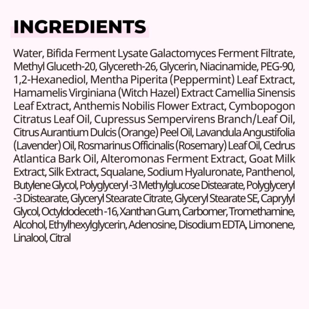 • KEY INGREDIENT : Bifida, Tingle pore omplex, Mentha piperita leaf extract, Camellia sinensis leaf extract, hamamelis virginiana extract, Lavadula angustifolia oil, Anthemis nobilis flower extract.