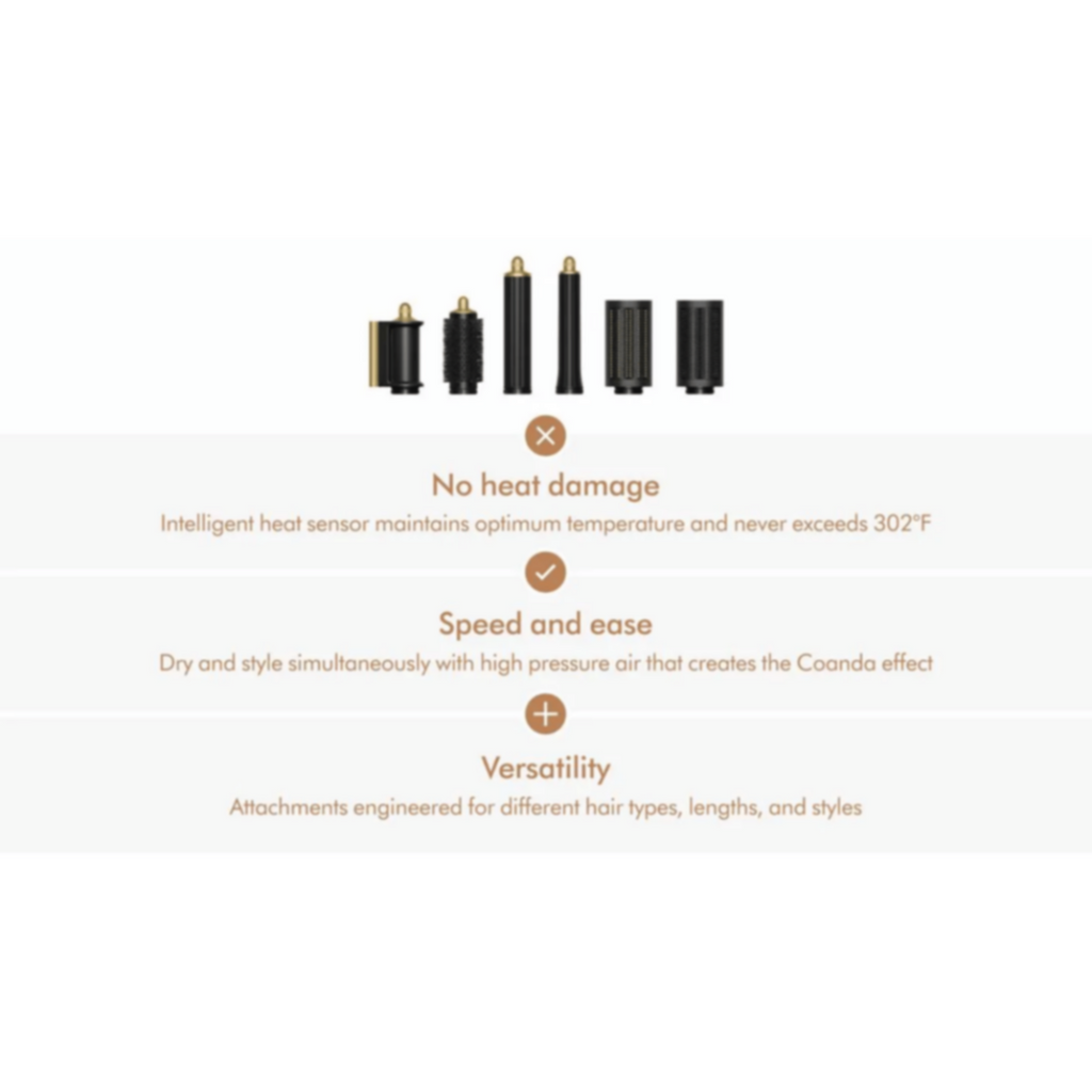 • Includes: Dyson Airwrap Multi Styler & Dryer, 30 mm Airwrap barrel, 40 mm Airwrap barrel, Coanda smoothing dryer, Firm smoothing brush, Soft smoothing brush, Round volumising brush, Storage case, Filter cleaning brush