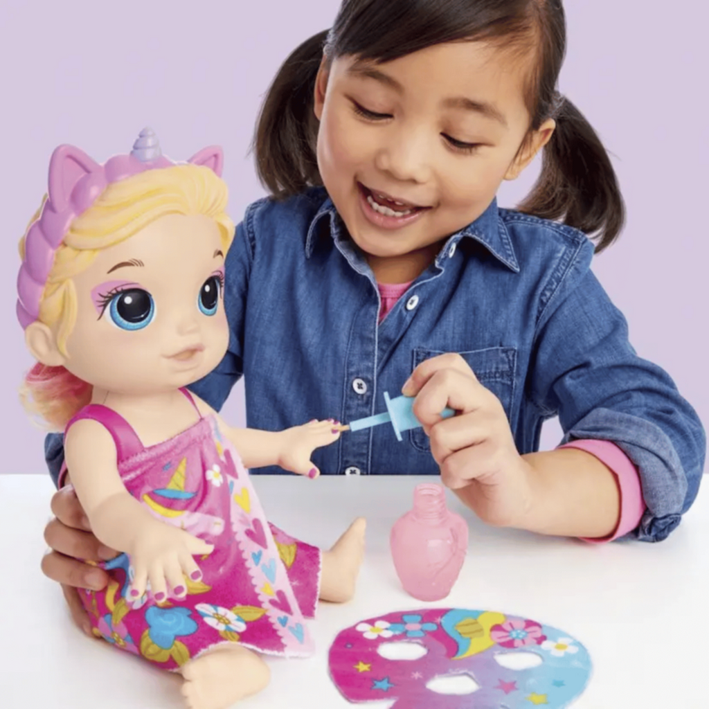 Pamper baby with spa day accessories to make her feel glamourous! With ice cold water, fill the pretend nail polish bottle and give Baby Alive Glam Spa Baby doll a color reveal mani-pedi. Then fill a bowl with ice cold water and soak doll’s mask -- apply to her face and remove for a gorgeous eye makeup reveal! This adorable 12.8-inch waterplay doll comes wearing a pink molded swimsuit and attached themed headband. She also features unicorn-themed spa doll accessories, including a towel wrap, doll mask and pretend nail polish bottle. Plus, she even comes with a comb for kids to brush and style her pink color-streaked ponytail! Glam Spa Baby makes a fun makeup-themed doll for girls and boys ages 3 and up. This Baby Alive doll is also a fantastic toy for kids’ birthday and holiday gifts. Baby Alive and all related properties are trademarks of Hasbro.