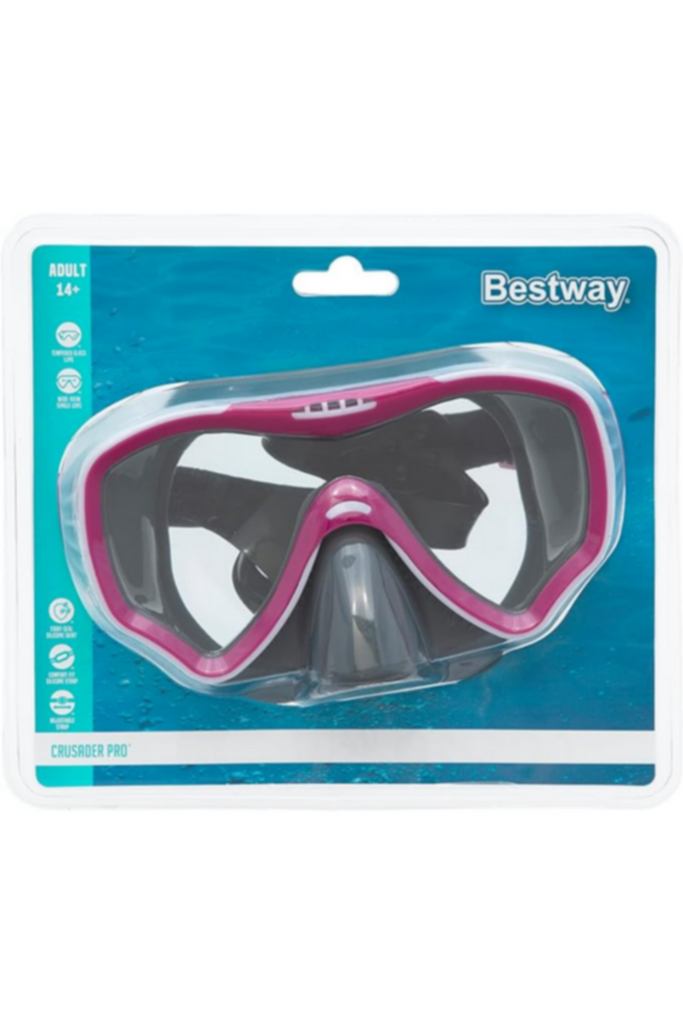 Hit the water and have an amazing adventure with the Bestway Crusader Pro Mask! Great for swimming in a pool or exploring the depths of the ocean, this mask is perfect for adults, ages 14 and up. Ultra-Clear Tempered Glass Single Lens: For premium durability, the Crusader Pro Mask's lens is constructed with a scratch-resistant tempered glass that is durable and long-lasting. The single lens provides a wide view of the scenery around you through the ultra-clear, high definition material. This premium construction is great for deeper dives and more competitive wear. Comfortable Fit: The flexible, leak-resistant silicone edge skirt secures comfortably on your face, without any water seeping in. This mask also features a fully adjustable silicone head strap that can be tightened or loosened for the optimal fit. The Crusader Pro is constructed with non-latex and non-PVC based materials, ensuring safety, durability and upgraded comfort. With the Bestway Crusader Pro Mask, nothing will stand in the way of adventure this summer!