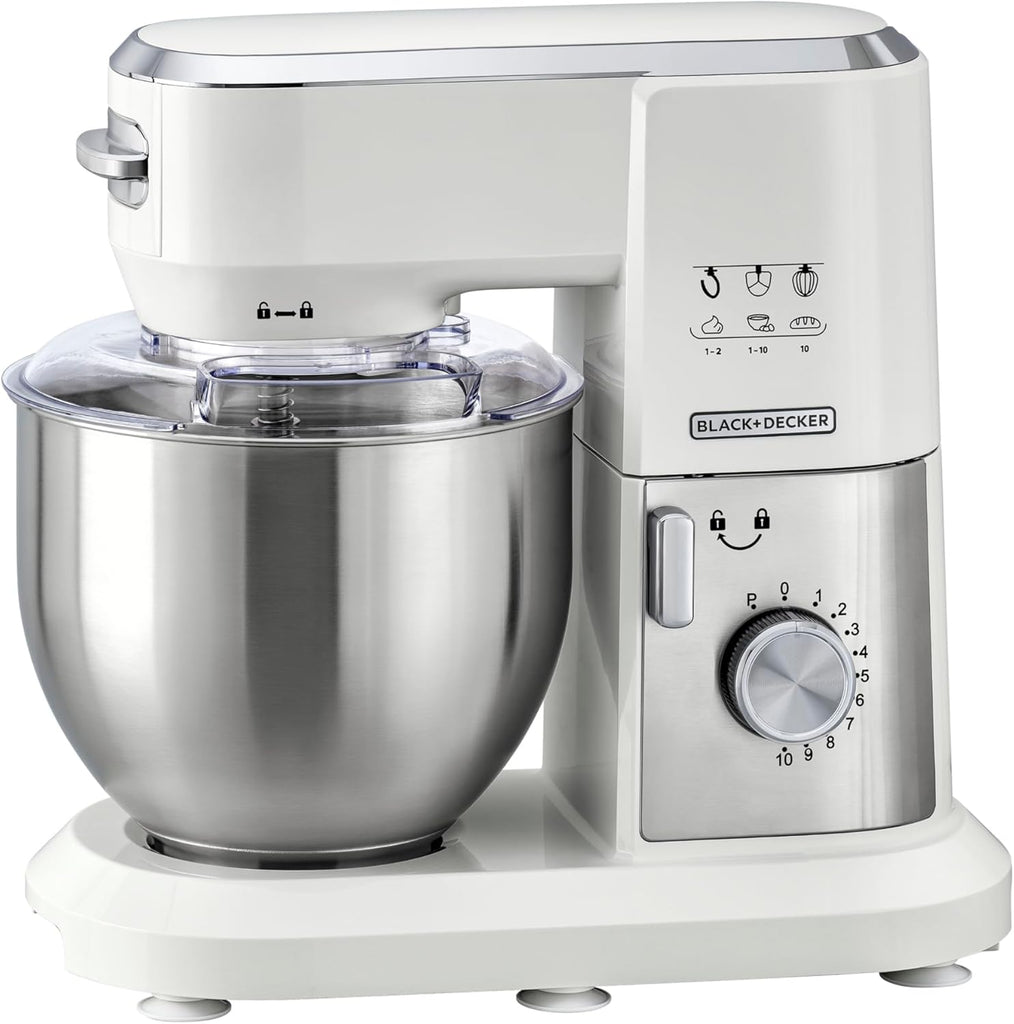 Elevate your baking and cooking with the Black & Decker MKM100‑B5 multifunction stand mixer. Powered by a robust 1000 W motor and equipped with planetary mixing action, this machine delivers even, consistent mixing every time. Its generous 6 L stainless steel bowl lets you prepare large batches—from dough and batters to whipped creams and meringues. The tilt-head design, transparent splash guard, and pulse plus 10-speed control give you precise control and mess-free operation. Whether you're kneading heavy bread dough or whipping delicate mixtures, the MKM100‑B5 combines performance, durability, and convenience for home chefs and baking enthusiasts.