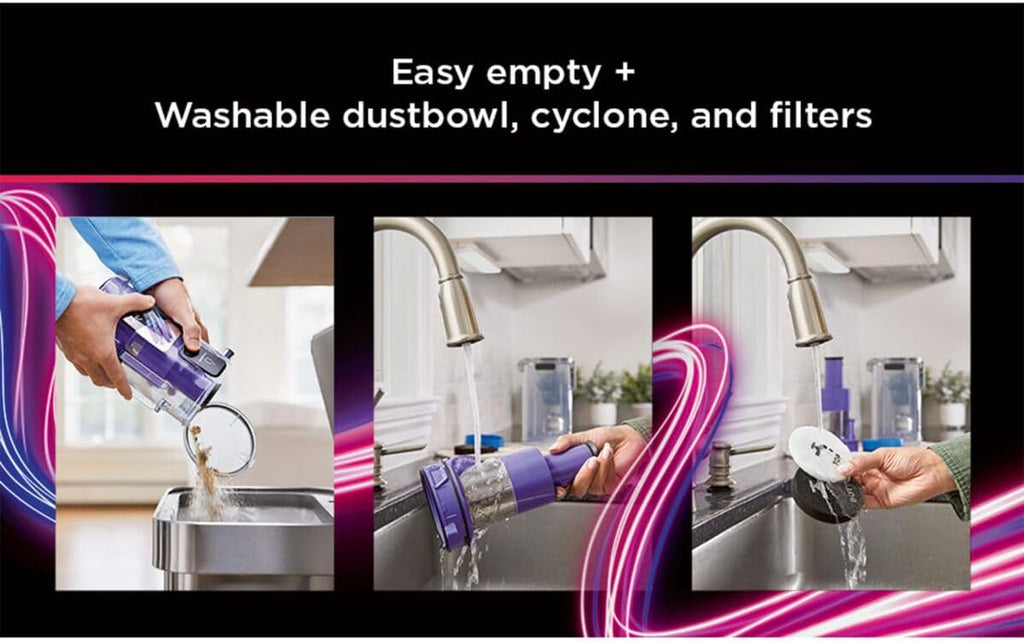 ◆ Cyclonic filtration & washable filters – maintains suction power and performance.