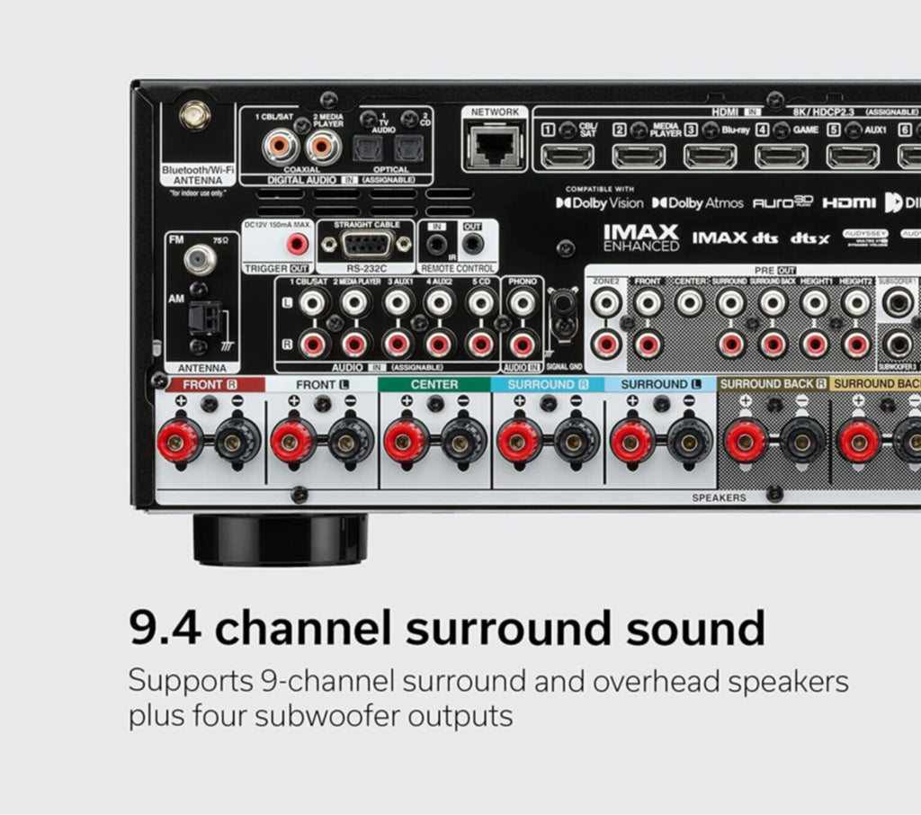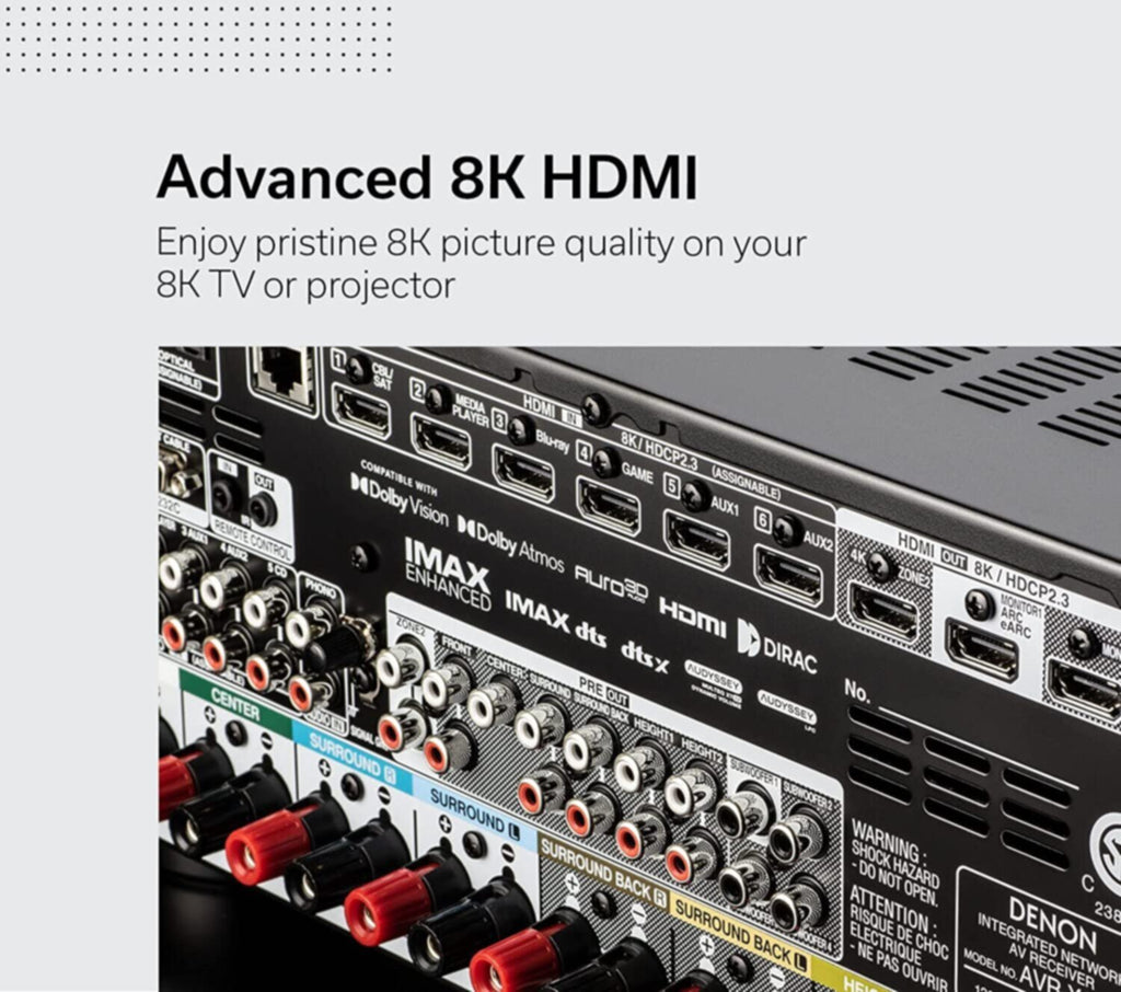• Advanced 8K home theatre: 8K video is supported on all six HDMI inputs and two of the three outputs. Enjoy easy video compatibility and great picture quality with HLG, HDR, Dolby Vision, HDR10+, and Dynamic HDR passthrough.