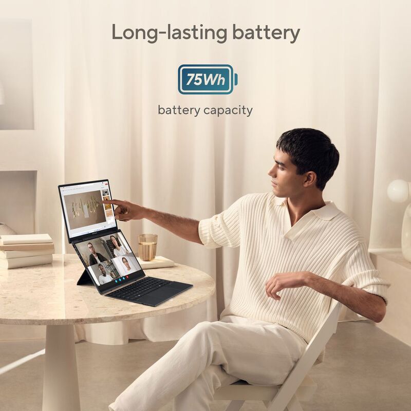 • Display: Dual 14 inch 3K (2880 x 1800) OLED touchscreens with 16:10 aspect ratio, 120Hz refresh rate, 0.2ms response time, 100% DCI P3 color gamut, and PANTONE Validated for vibrant and accurate visuals.