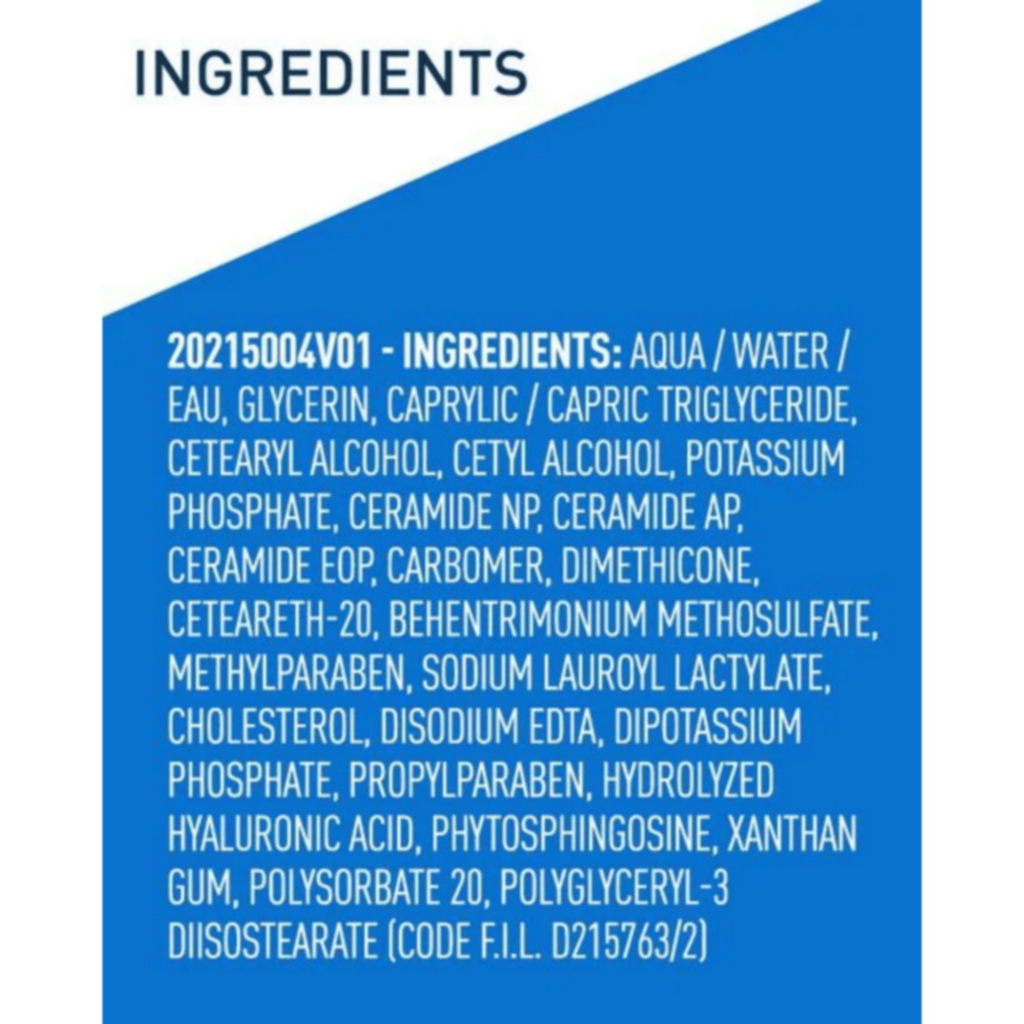 â—† Ingredients: AQUA / WATER / EAU, GLYCERIN, CAPRYLIC/CAPRIC TRIGLYCERIDE, CETEARYL ALCOHOL, CETYL ALCOHOL, POTASSIUM PHOSPHATE, CERAMIDE NP, CERAMIDE AP, CERAMIDE EOP, CARBOMER, DIMETHICONE, CETEARETH-20, BEHENTRIMONIUM METHOSULFATE, METHYLPARABEN, SODIUM LAUROYL LACTYLATE, CHOLESTEROL, DISODIUM EDTA, DIPOTASSIUM PHOSPHATE, PROPYLPARABEN, HYDROLYZED HYALURONIC ACID, PHYTOSPHINGOSINE, XANTHAN GUM, POLYSORBATE 20, POLYGLYCERYL-3 DIISOSTEARATE.