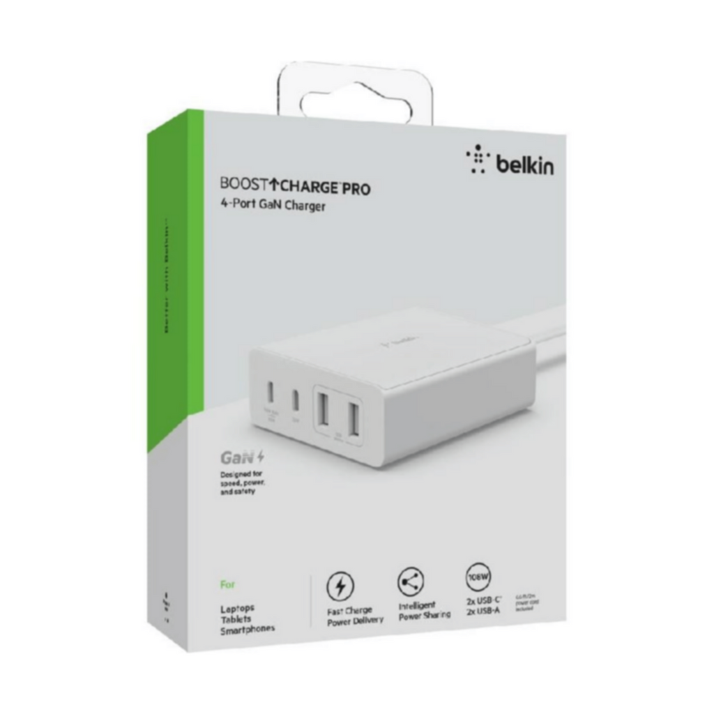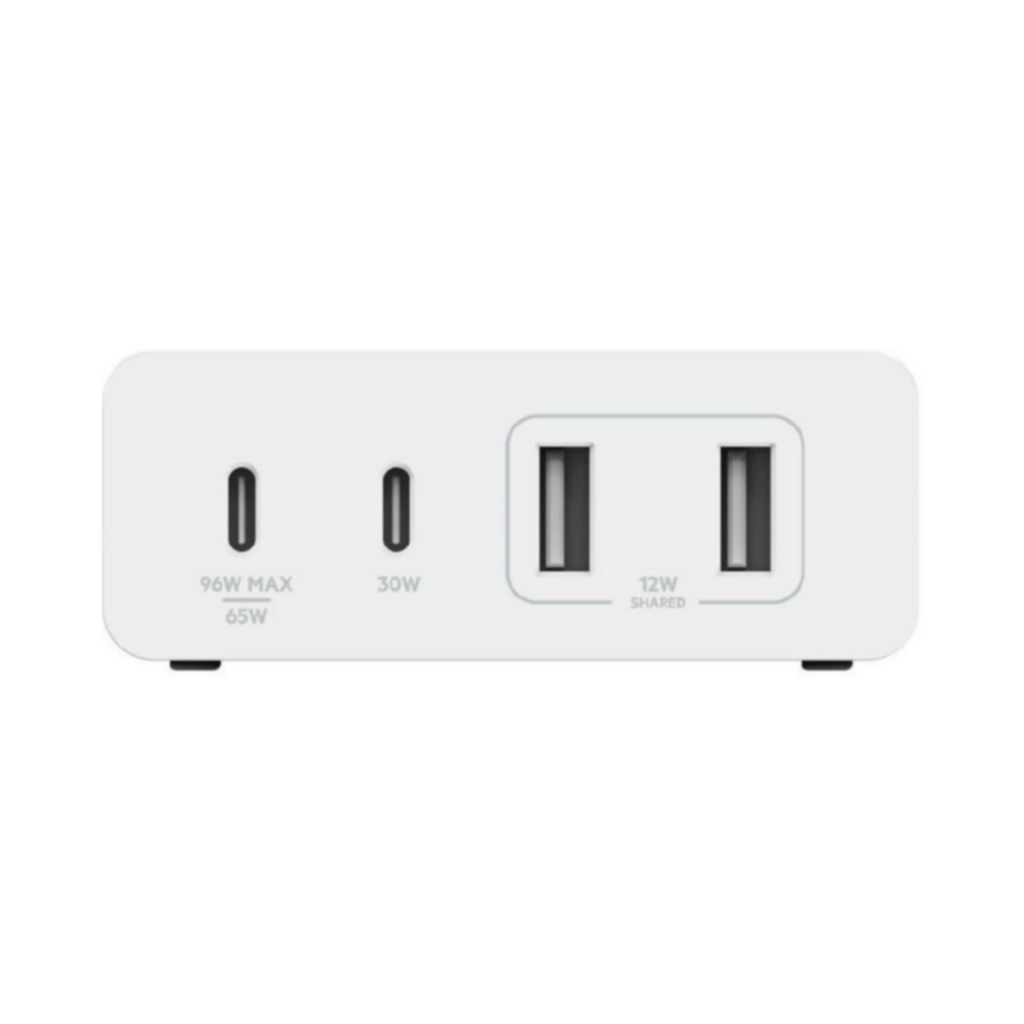 • 4 port GaN charger includes 2x USB C and 2x USB A ports.