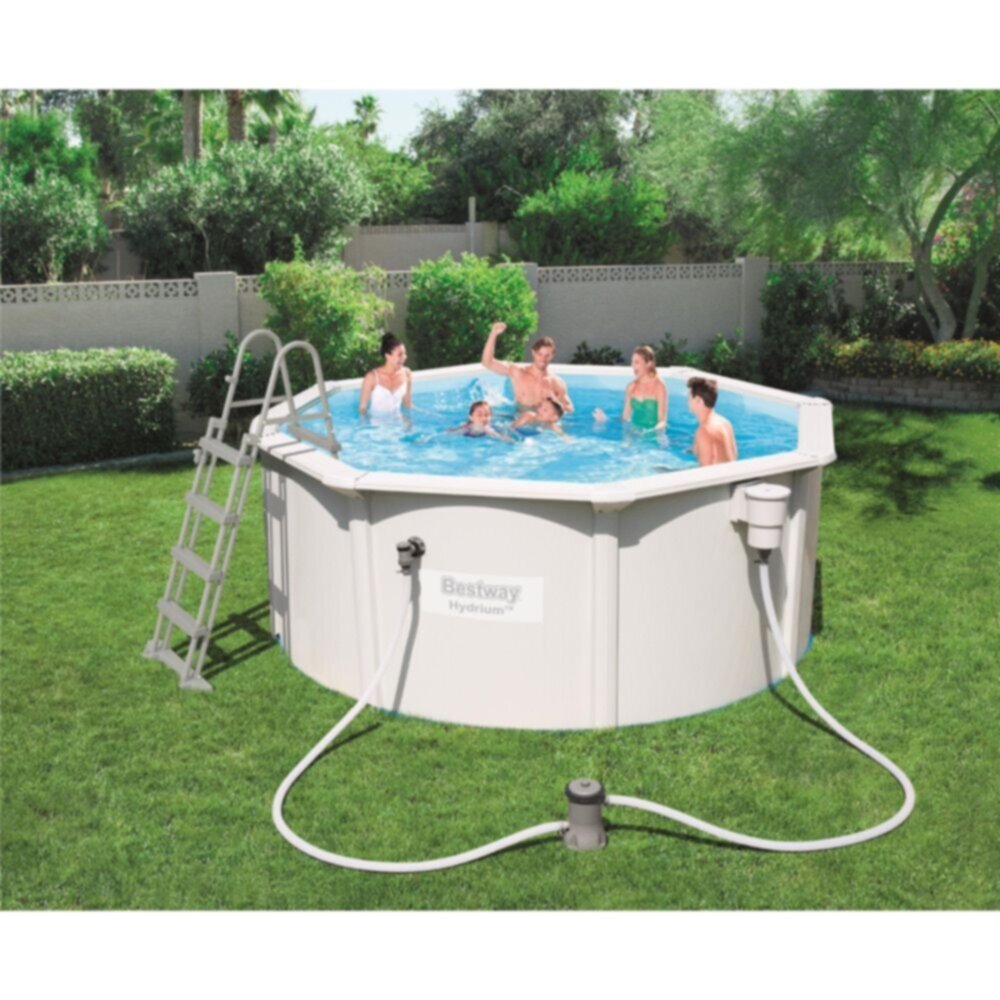 Make this summer a fun one for you and your family with the 10′ x 48″/3.00m x 1.20m Bestway Hydrium Steel Wall Pool Set. This pool is built to stay up 365 days a year! It features thick 0.3 mm steel sidewalls to ensure your pool lasts season after season. Included with this set: a ground cloth to protect your lawn and a ladder for easy entry and exit and a 530 gal pump to keep your water sparkling clean and instructional DVD. The UV coated liner protects against sun damage and the integrated skimmer keeps pool water free from debris. With proper maintenance, your Bestway Hydrium Steel Wall Pool will give your family years of summer swimming. The Steel Wall pool is easy to assemble and ready to fill in only minutes. Don’t miss out on this great pool. This pool is the perfect size for adults and older kids. Make your summer a splash with a Bestway Hydrium Steel Wall Pool Set!