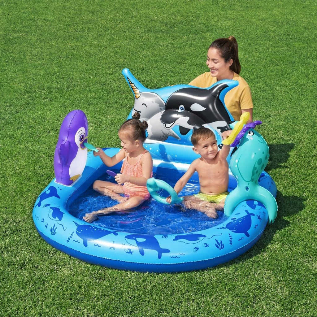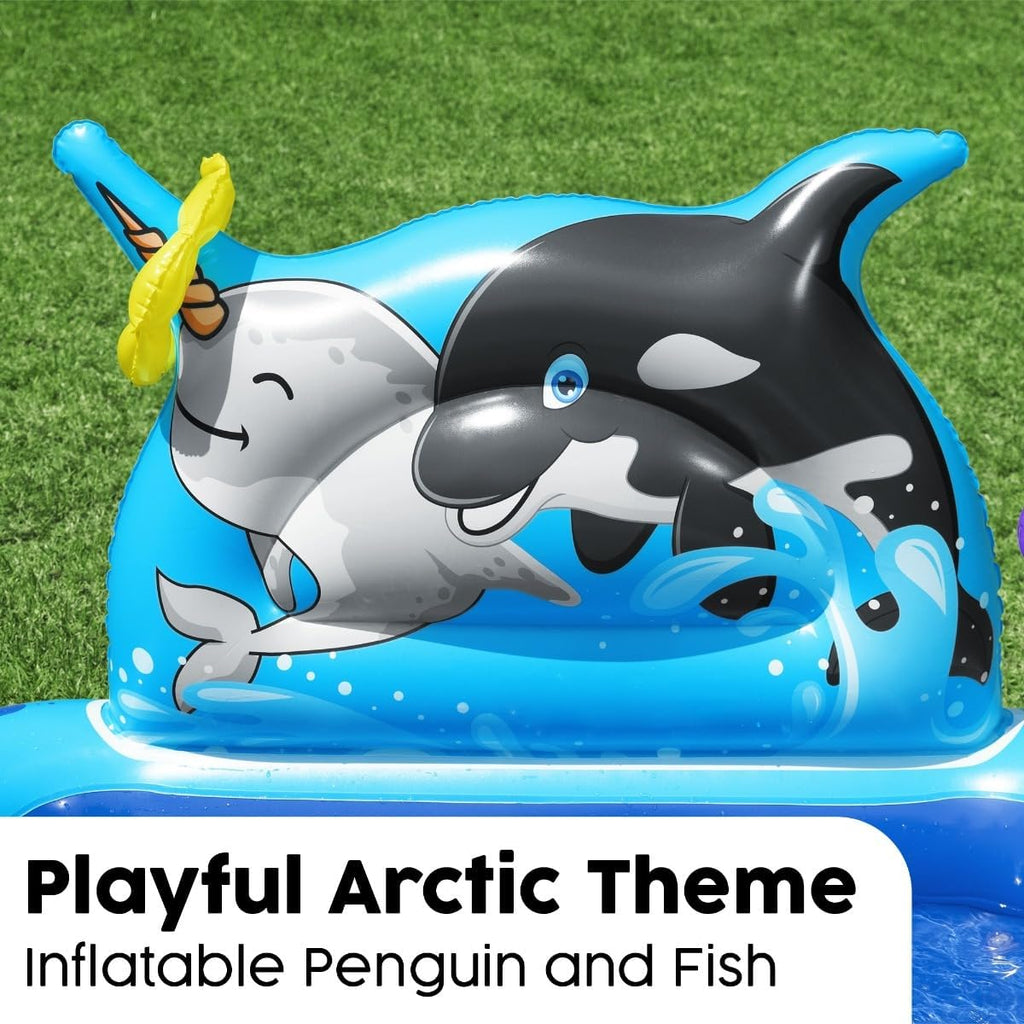 Turn your backyard into a frosty fun zone with the Bestway® Polar Pals™ Water Play Centre – a cool and exciting way for little explorers to beat the heat! Measuring 134 x 131 x 73 cm when inflated, this interactive water play area brings the magic of the Antarctic right to your garden.Crafted from durable PVC for long-lasting play, the Polar Pals™ centre features an adorable arctic design complete with a ring toss game featuring a seal and narwhal, and an inflatable penguin ready to serve up foam fish for fishing fun. Perfect for toddlers and young kids, it encourages imaginative water play and motor skill development.