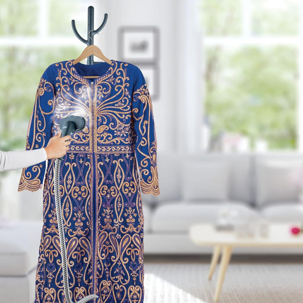 The Black+Decker GST1820 B5 Garment Steamer is a high performance solution for efficient garment care. With a powerful 1950W output, it delivers continuous steam to eliminate wrinkles and refresh fabrics. Its integrated ironing board and adjustable features make it versatile for various clothing types.