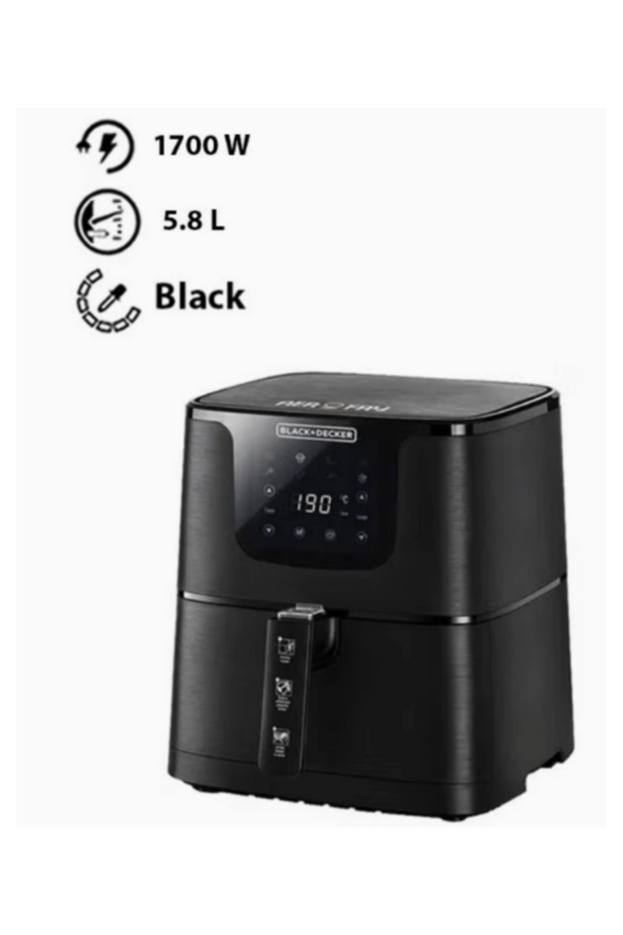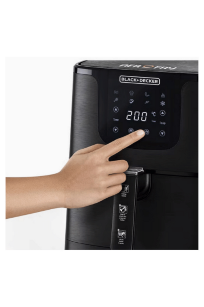 The Black+Decker AF700 Air Fryer is a perfect choice for healthy tasty food with little or no oil. The premium style brushed matte finish makes the air fryer blend into your modern home. The large 5.8L capacity ensures you can cook large serving portions for the family. The 80 to 200 degree digital temperature controls lets you choose the right temperature for your food for the perfect results. The 60 minute timer offers cooking versatility. The 7 pre-set modes offer the user an easy selection for quick cooking. The LED display with the touch control adds convenience with quick selection options. The special basket design allows for 360 degrees of hot air circulation for effective cooking results. The basket is diswasher safe for added ease. The anti-slip rubber feet prevent the unit from accidentally moving. The cool-touch housing and handle for additional safety while handling. In an age of fast paced, busy and stressful life, a home cooked meal with the right balance of flavour and health is often left to be desired. Introducing the AEROFRY from Black+Decker. Built around the principle of Rapid Air Convection heating system, it is equipped with a 4.3L food basket with a 7.5L capacity to cook delicious recipes. The Black+Decker AF700 Digital XL Air Fryer is ideal for frying and roasting. Delicious food is finally guilt free, thanks to the Black+Decker AerOfry. It cuts down on the oil so that you can relish the mouthwatering, crispy food without the added fat. The digital temperature control helps you set the right temperature required for your dish. The smart cook function saves your favourite cooking combination for a one touch quick start. The rapid air convention heating inside the fryer results in quick and even cooking. Once the food basket is inserted into the chamber and by selecting the correct heat setting on the temperature dial, the hot air induces a rapid air flow around the food in the basket. The AEROFRY is designed to function even without oil. Instead of using oil as frying medium, the AF700 uses hot air to fry, bake and grill food. It can fry all your favourite food including chicken, fries and onion rings with little to almost no oil thereby, creating a guilt-free cooking experience.The frying basket of this Black and Decker aero fryer is easily removable and dishwasher safe for easy maintenance. Thanks to the cool touch housing of this air fryer, you can touch its handle without burning your hand. The safety lock ensures a secure fit of food basket before you start the frying process. This air fryer has non slip feet that provide a firm grip on any kitchen countertop.