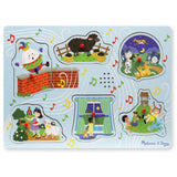 Sing along with favorite childhood characters like Humpty Dumpty and Jack and Jill with this unique wooden peg song puzzle! Match the six illustrated wooden puzzle pieces to the pictures in the beautifully carved wooden puzzle board to hear six different nursery rhymes (Humpty Dumpty, Baa Baa Black Sheep, Hey Diddle Diddle, Mary Had a Little Lamb, Twinkle Twinkle Little Star, and Jack and Jill). Plastic pegs make it easy for small hands to grasp and manipulate the pieces. Lyrics are included on the puzzle so kids can sing along as they complete the puzzle!
