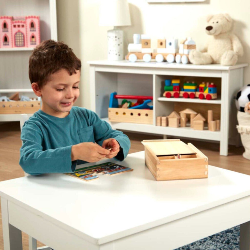 Set includes four wooden, 12 piece vehicle jigsaw puzzles- a race car, a steam engine, a school bus and a fire engine- each stored in a separate compartment of a sturdy wooden box! The slide on box lid doubles as a convenient puzzle board! Each puzzle piece is shape coded on the back for easy sorting. Great for travel!