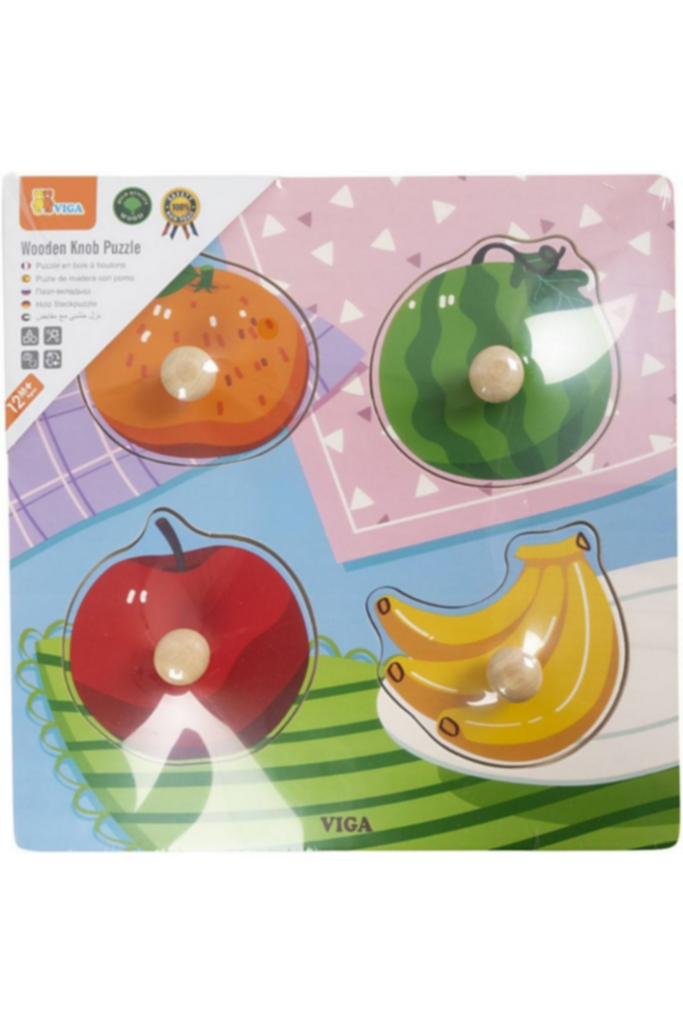 • Sweet little jigsaw puzzle with pegs suitable for toddlers. Hidden behind each of the fruit pieces is a picture showing what the fruit looks like inside