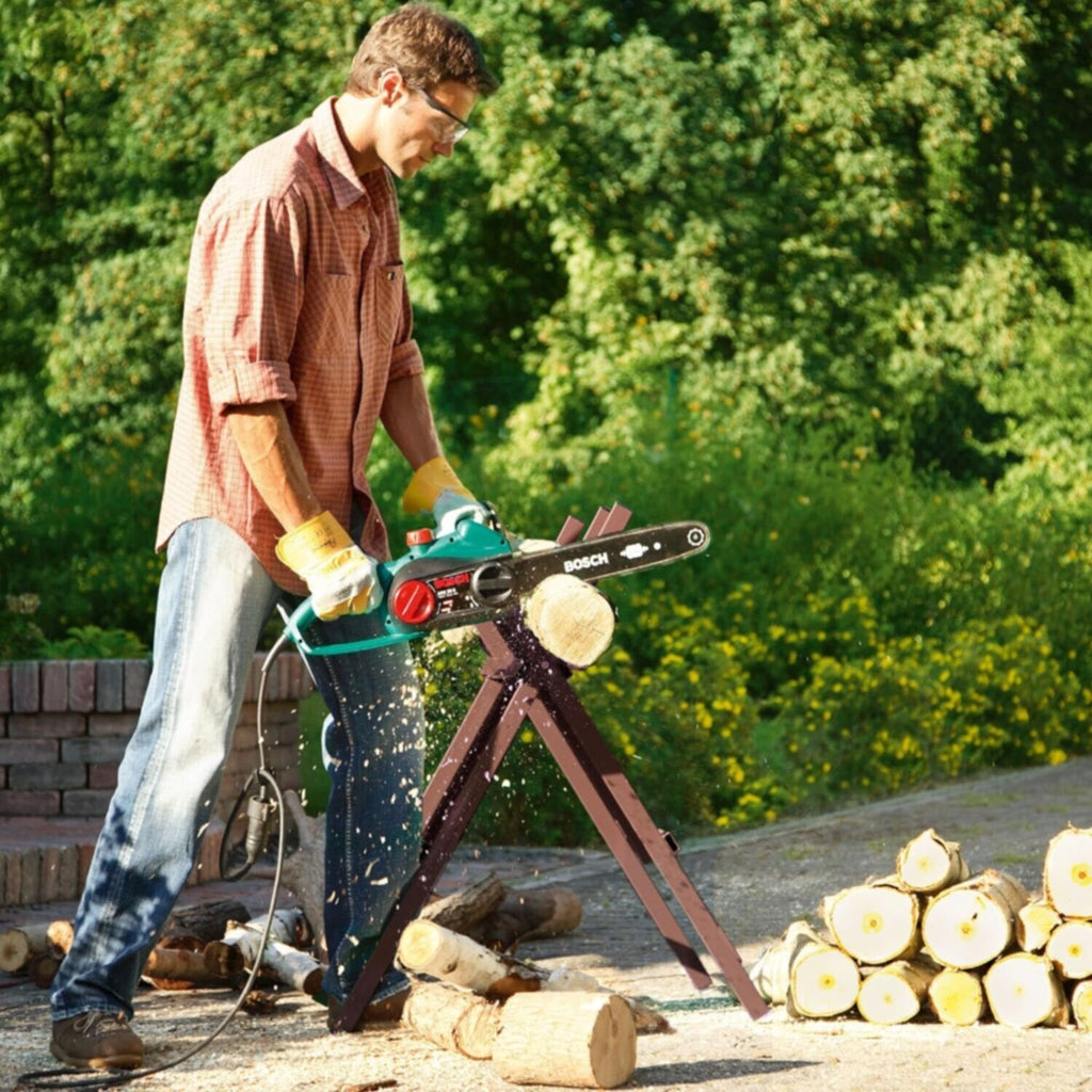 This Bosch corded electric chainsaw weighs 4Kg. With a 1800-watt engine size, this power tool benefits from a chain brake and anti-kickback for safety and handling comfort. There's also an anti-vibration, wrap-around handle and a two-handed grip for security. Further safety features include a bar-tip guard, safety throttle, and front hand guard. For convenience, the device has a chain catcher and an automatic chain oiler.