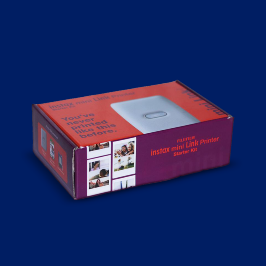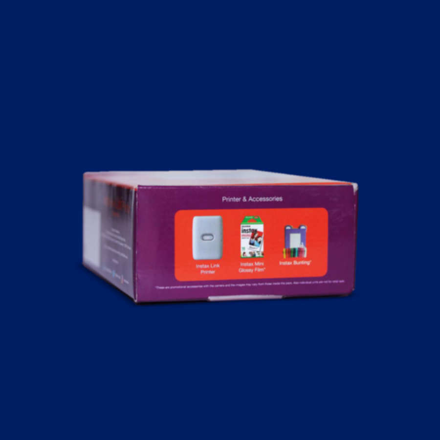• Box Contains: Instax Mini Link Printer 1 Unit, Charging cord, Instax Mini Film (10 x 1), Bunting Set 1 Unit, Instruction Manual