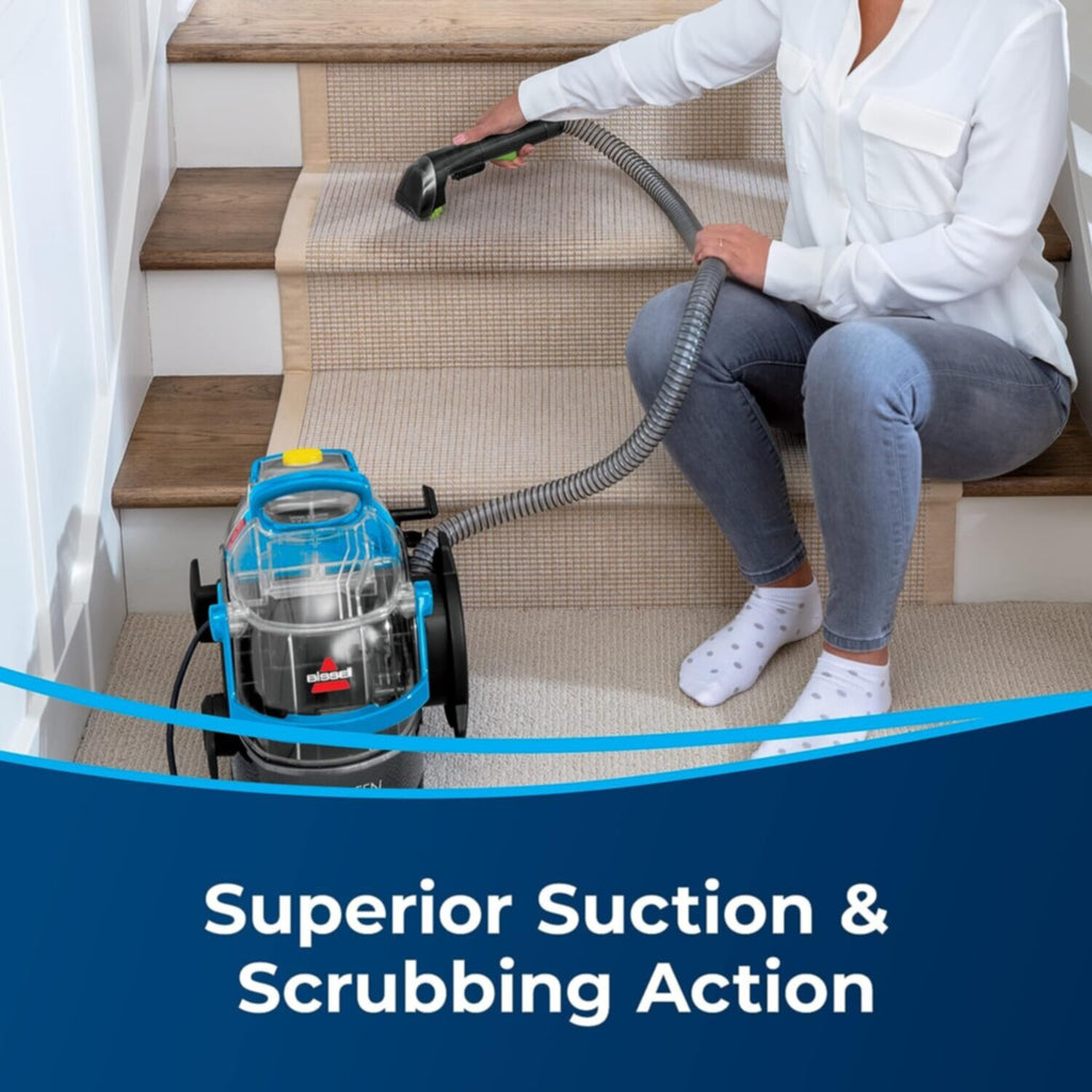 Permanently removes stains, combination of powerful suction and professional formula ensures stains are gone for good.Extra Reach: 5 foot hose and 20 foot power cord let you clean hard to-reach areas.3inch Tough Stain Tool: Scrubs and suctions away tough pet stains on carpet, upholstery and auto interiors.