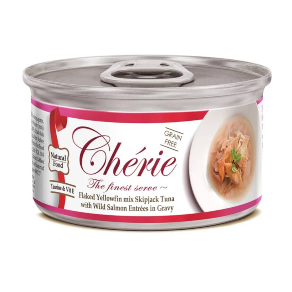 Cherie Flaked Yellowfine Mixed Skipjack Tuna with Salmon Entrees In Gravy 80G