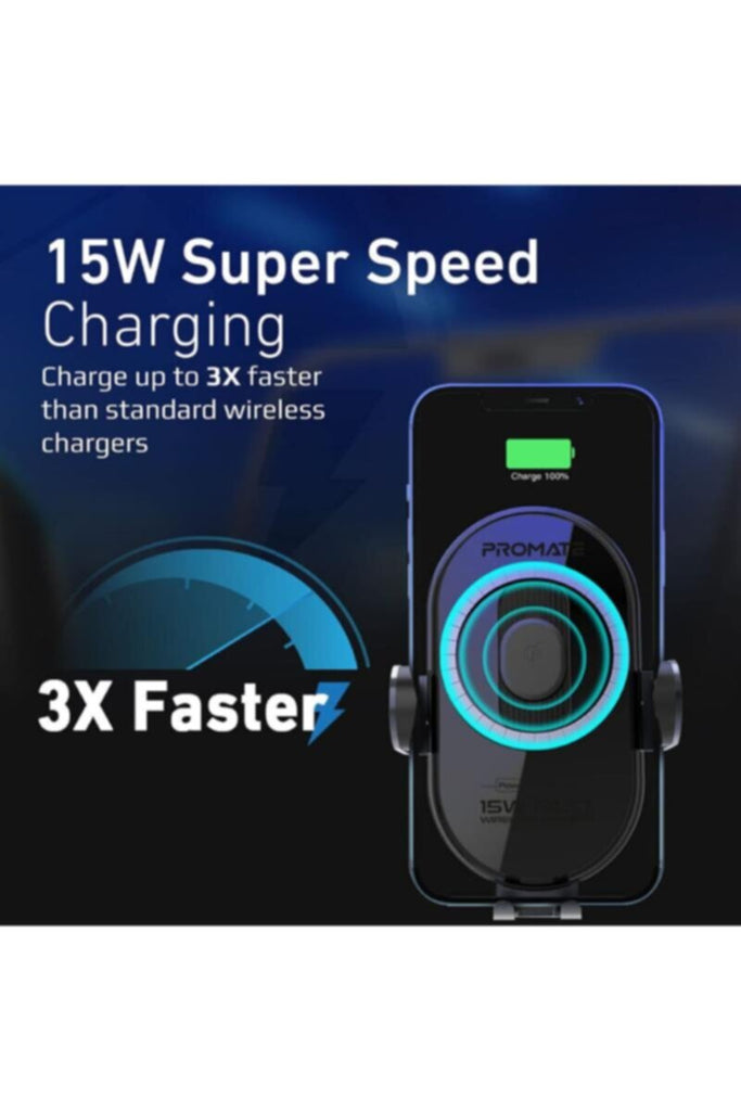 The PowerMount 15W Qi Wireless Charging Mount is a universal smartphone solution engineered to enhance your driving experience. This one of-a kind charger features a smart Qi charging sensor that automatically aligns with your smartphone for optimum charging performance. The one touch mechanism allows you to easily mount and remove your smartphone with one simple hand motion. Designed for performance on the road the strong electronic clamps keep your Qi enabled devices in place even on the roughest terrain. Features Ultra Fast Charging Up To 15W While Driving: Charge up to 3 times faster than standard wireless chargers with up to 15W super speed charging only with the PowerMount 15W. Enjoy charging outputs from 5W/7.5W/10W to 15W for super fast charging while driving. Now you never have to worry about your battery running out. Just place and enjoy safe and fast charging. Smart Coil Alignment for Enhanced Charging Performance: The charging coil on the smart car charger automatically aligns with the smartphone s charging Coil for the best charging experience. This Auto Alignment Qi Coil makes the PowerMount 15W one of the best car charging phone mounts that adjust for enhanced charging performance, and you don t need to adjust or match the smartphone charging coil accordingly, just simply place your phone on the Promate smart car charger and enjoy worry free charging. Automatic Intelligent Clamping with One Touch Release Button: The Promate PowerMount 15W Qi wireless charger for the car has a built in advanced sensor that allows one hand operation. Just place your phone in the phone holder and the wireless charger mount automatic clamping and keep the phone in place and begins charging. A one touch button on the back of the mount releases the phone without unplugging the device enhancing its handsfree function. Qi Certified Car Charger for Compatible Devices: The Promate PowerMount 15W is Qi certified. This means all Qi enabled devices can be connected and charged to this device, safely and effectively. This way you can avoid multiple wires and enjoy fast charging, wirelessly. FOD Technology for Completely Safe Charging: It also has built in FOD which means that when it detects a foreign object on your Qi enabled smartphone, such as a metal plate, the charging process will promptly stop to prevent overheating and damage to your smartphone. Optimal 360 Degree Viewing with Gooseneck Dash Mount: 360 degree rotation and flexible gooseneck mount for easier use of functions. This 360 degree swivel head, lets you tilt the mount to fit your optimum viewing angle as well, making this great for listening to music or using navigation while driving. Gooseneck hose holds the phone near or far away from the driver; 360 degree rotation, freely adjusts the smartphone s stand to your ideal angle, easily look at your device's screen. Versatile High Stability Mounting Options: PowerMount 15W offers a versatile mounting option. You can easily mount it on the windshield or dashboard using the suction cups. You can also clip the PowerMount 15W on your AC vent slot using the steady and stable clamps. Secure and Durable Design: Soft silicone pads on the holder s arms and silicone clips at the bottom protect your phone and vent from scratches. Elegant aluminum alloy holder arm along with slim and compact design makes the PowerMount 15W durable and portable. Power up the Device with 1.2m Type C Cable: The Promate PowerMount 15W car charger can be Powered up using a USB Type C cable. This way you can conveniently use the 1.2 m cable in the box to charge your wireless charger and enjoy fast charging on the go. LED Light Indicator: To let you inform about the charging progress, the wireless charging mount comes with a built in LED light that illuminates a Blue light while your device is charging. Case Compatibility for Hassle Free Charging: You can now charge without the hassle of removing your case. The PowerMount 15W Wireless Charging Pad is engineered to work with most lightweight cases making it super convenient and easy to use. Anti Slip Holder for Steady Placement: The strong electronic clamps keep your Qi enabled devices in place even on the roughest terrain. Now you never have to worry about your phone slipping or misaligning while using this car charging mount, even during bumpy and uneven roads. Safety and Protection Guaranteed: The built in Safety IC provides protection against overcharge, overcurrent, short circuit, and temperature control for your digital devices and protects them from any charging accidents, and provides you with worry free, super fast charge. It is safe and dependable. It ensures your device is completely protected from overheating as well. Wide Compatibility for 4.7 6.7 Qi Devices: PowerMount 15W works with 4.7 6.7 Qi Enabled smartphones like iPhone 12/12 pro/12 pro max/ 12 mini, Samsung Galaxy S21/S20/S10, Galaxy A52 5G, Samsung Galaxy Note 20 series, Google Pixel 5, Google Pixel 4A, Oppo Find X3 Pro, OnePlus 9 series, Xiaomi Mi 11, Sony Xperia 1 III.