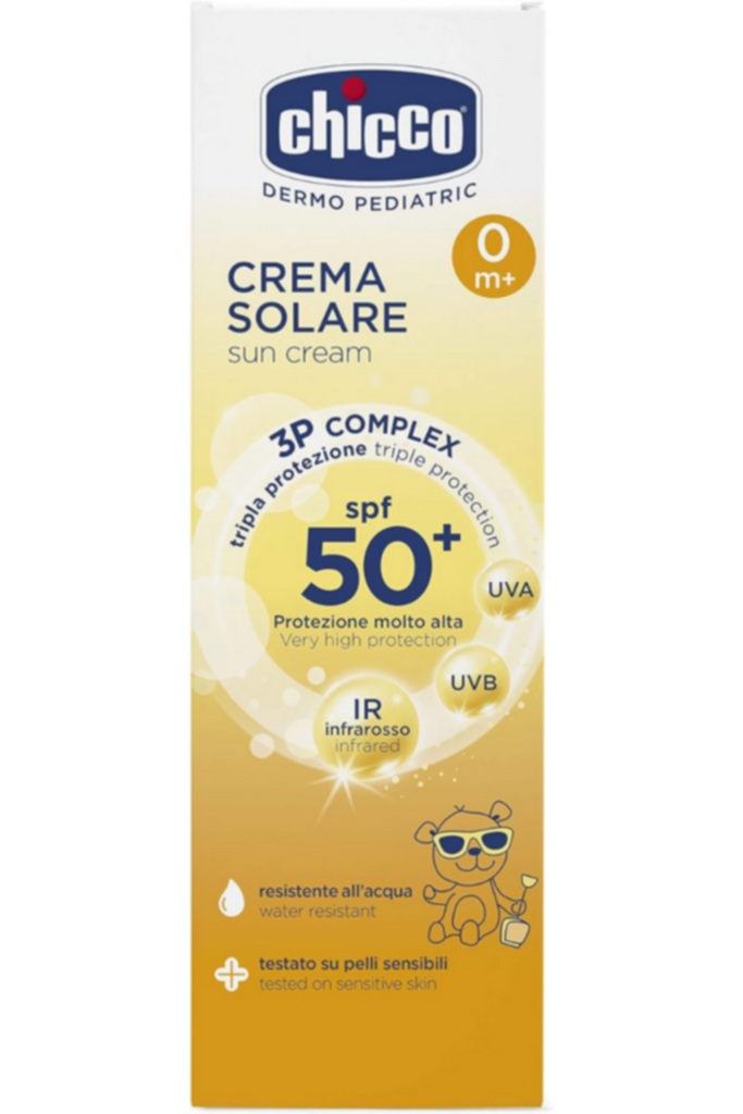 Chicco sun cream with very high protection, for sensitive and delicate skin. it nourishes the skin, protecting it from all type of sun rays (uva, uvb and the effects of infrared rays). with vitamin e and physalis extract.chicco's 50+ sunscreen with very high protection is designed to protect the delicate skin of children, nourishing it and protecting it from all types of uva, uvb sun rays. its formula does not contain parabens, phenoxyethanol, peg and fragrances. enriched with active ingredients such as vitamin e and physalis extract with antioxidant action. water resistant formula. the light texture makes it practical and suitable for any occasion. 75 ml format