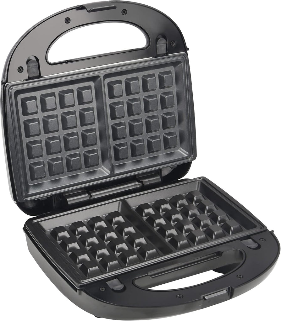 • 3 in-1 Functionality: Comes with interchangeable plates for sandwiches, grilling, and waffles.
