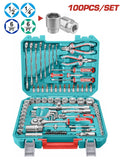 • Include: 1 Pcs 1/2"" ratchet wrench,45T , 18Pcs 1/2"" Hexagonal Socket: 10 11-12 13-14 15-16 17-18 19-20 21-22 23-24 27-30 32MM, 2 Pcs 1/2"" Extension bar:125mm 5"" / 250mm(10""), 1 Pcs 1/2"" Dr. Universal joint, 2 Pcs Spark plug socket 1/2""Dr.16MM&21MM, 1 Pcs 1/2""*3/8"" three way adaptor,1 Pcs 1/4"" ratchet wrench,45T, 13Pcs 1/4"" Hexagonal Socket:4 4.5 5-5.5 6-7 8-9 10-11 12-13 14, 2 Pcs 1/4"" Extension bar:50mm (2"") / 100mm(4""), 1 Pcs 1/4"" sliding ""T"" bar, 1 Pcs 1/4"" Dr. Universal joint, 8 Pcs Combination spanner:6 8-10 12-14 15-17 19MM, 1 Pcs 6"" Diagonal Cutting Pliers, 1 Pcs 6"" Long nose pliers, 1 Pcs SL6.5*100 Screwdriver, 1 Pcs PH2*100 Screwdriver, 14Pcs Bit socket:T10 T15-T20 T25-T27 T30-T35 SL4-SL5.5 SL6.5 PH1-PH2 PZ1-PZ2, 9 Pcs Hex key,1.5 2-2.5 3-4 5-6 8-10MM, 20 Pcs 1/4"" Screwdriver bits SL3,SL4,SL5,SL6,PH0,PH1,PH2,PH3,PZ0,PZ1,PZ2,PZ3,T10,T15,T20,T30,H3,H4,H5,H6 25mm, 1Pcs Screwdriver Bits holder, 1Pcs 1/4""*150mm Spinner handle