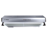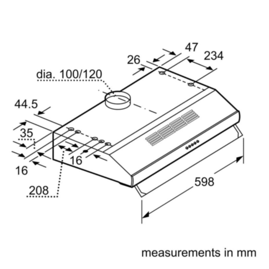 600 mmwidth Suitable for ducted or re circulated extraction Push button controls for3 speeds Twin motor Adjustable glass visor 2xhalogen energy saving lamps Metal grease filter, dishwasher safe Ducted extraction rate according to DIN/EN 61591: max.350m /h Noise level according to EN 60704 3 und EN 60704 2-13 at max. normal use exhaust air:68dB(A) re 1 pW (56dB(A) re 20 Pa sound pressure) Power rating:306 W Dimensions exhaust air (HxWxD):150 150x600x482mm 120 mmdiameter pipe Light Intensity:110lux Colour Temperature:2700 K