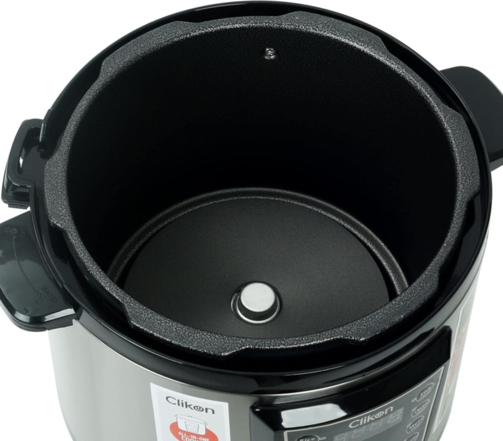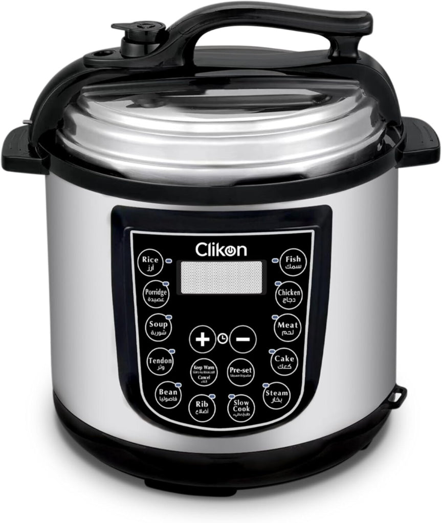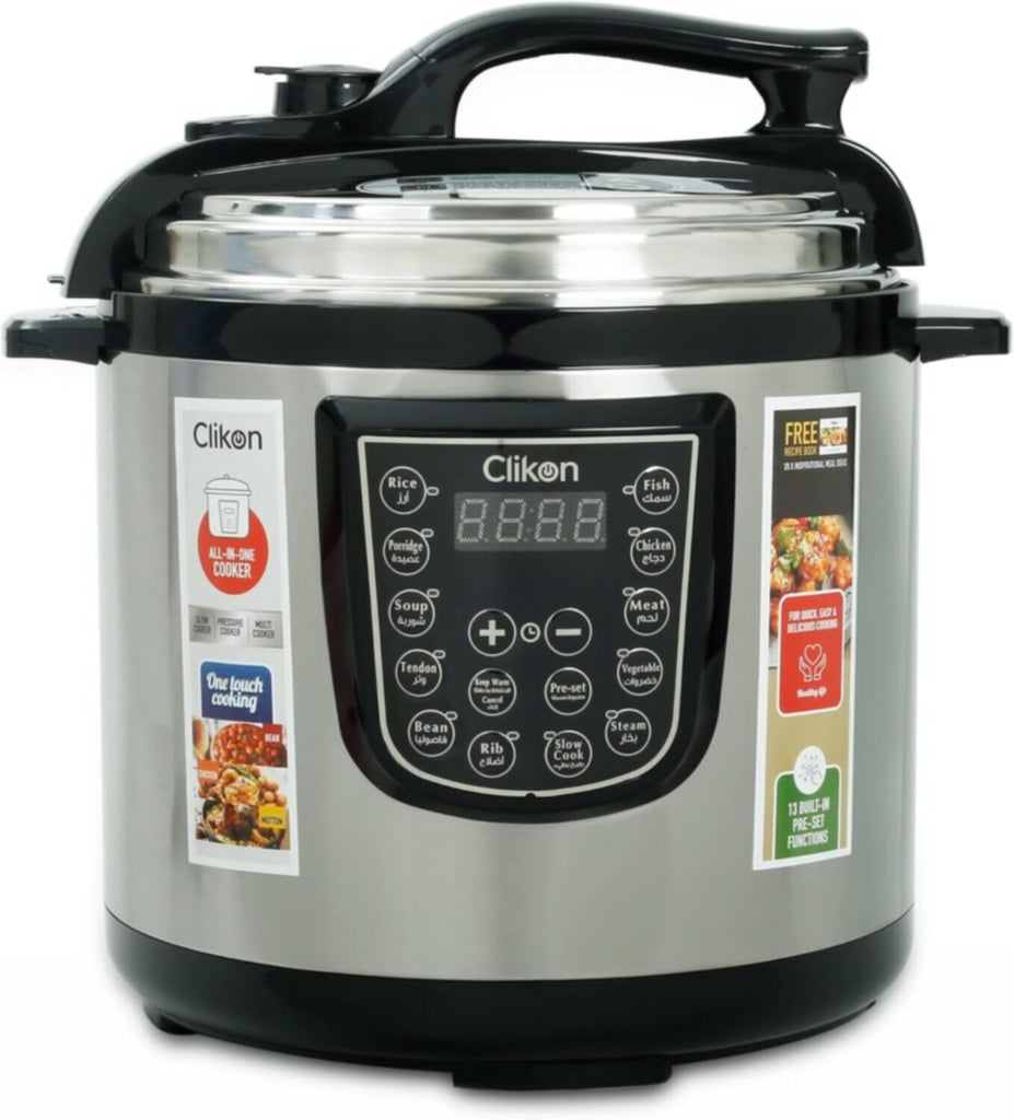 Clikon Multifunctional Electric Pressure Cooker, with a generous 6L capacity and a user friendly LED display. Seamlessly switch between cooking and warming modes for ultimate flexibility in meal timings. Specifically designed for baby foods, this cooker offers precise and gentle cooking to retain essential nutrients. With 13 built in preset functions, from steaming to slow cooking, it caters to a variety of culinary needs. The package includes a cooking pot, rice spoon, and measuring cup, ensuring you have all you need to create delicious meals right out of the box.