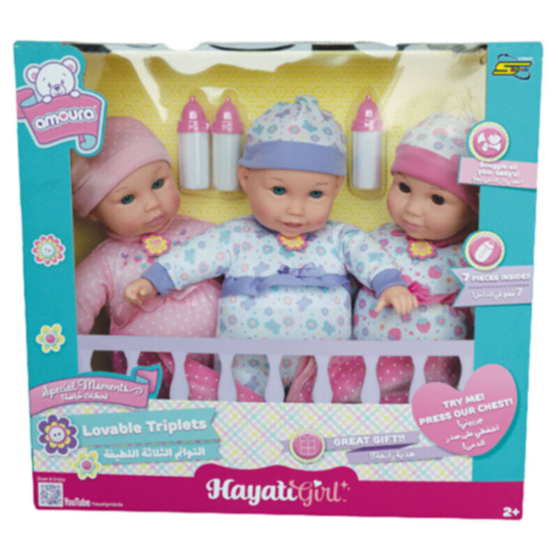 Three times the cuddles! These soft Lovable Triplet Dolls are fun for all ages. Featuring three 14inch Loveable Triplets Dolls with matching color coordinated outfits and hats. 12 unique phrases by pressing their chest.