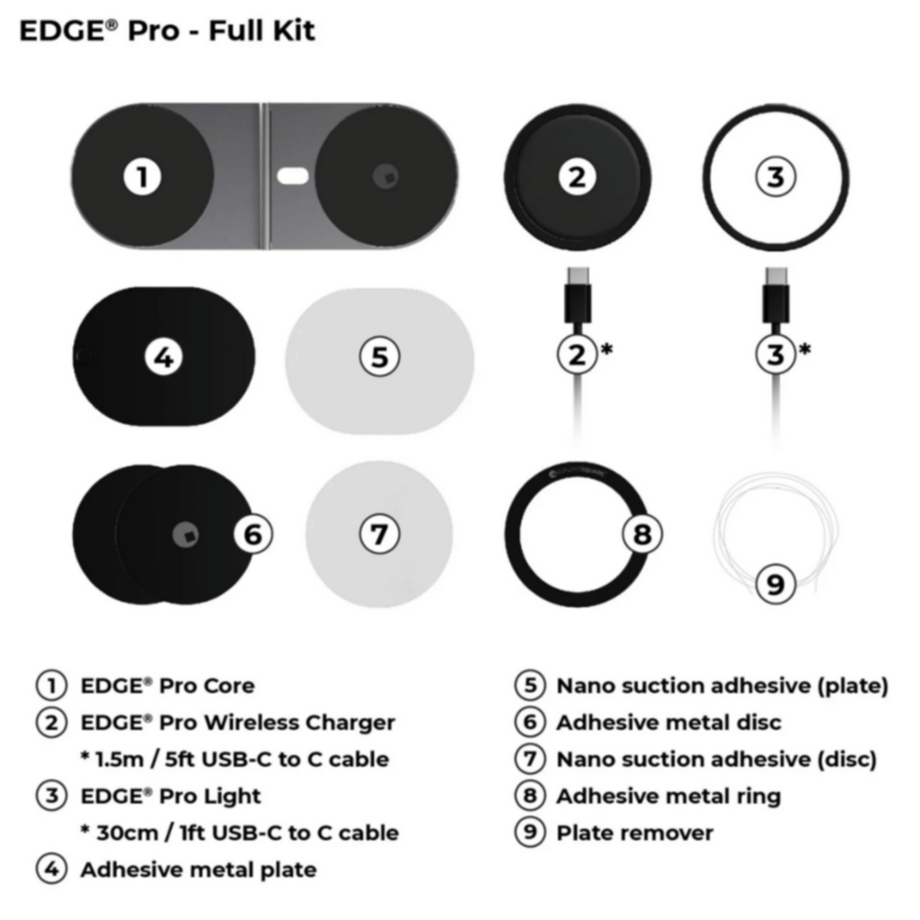 • The Full Kit includes EDGE Pro Core, a detachable arm able to hold tablets and smartphones, EDGE Pro Light and EDGE Pro Wireless Charger.EDGE Pro is based on MagSafe, but it's also compatible with Android phones, older iPhones, iPads and tablets.