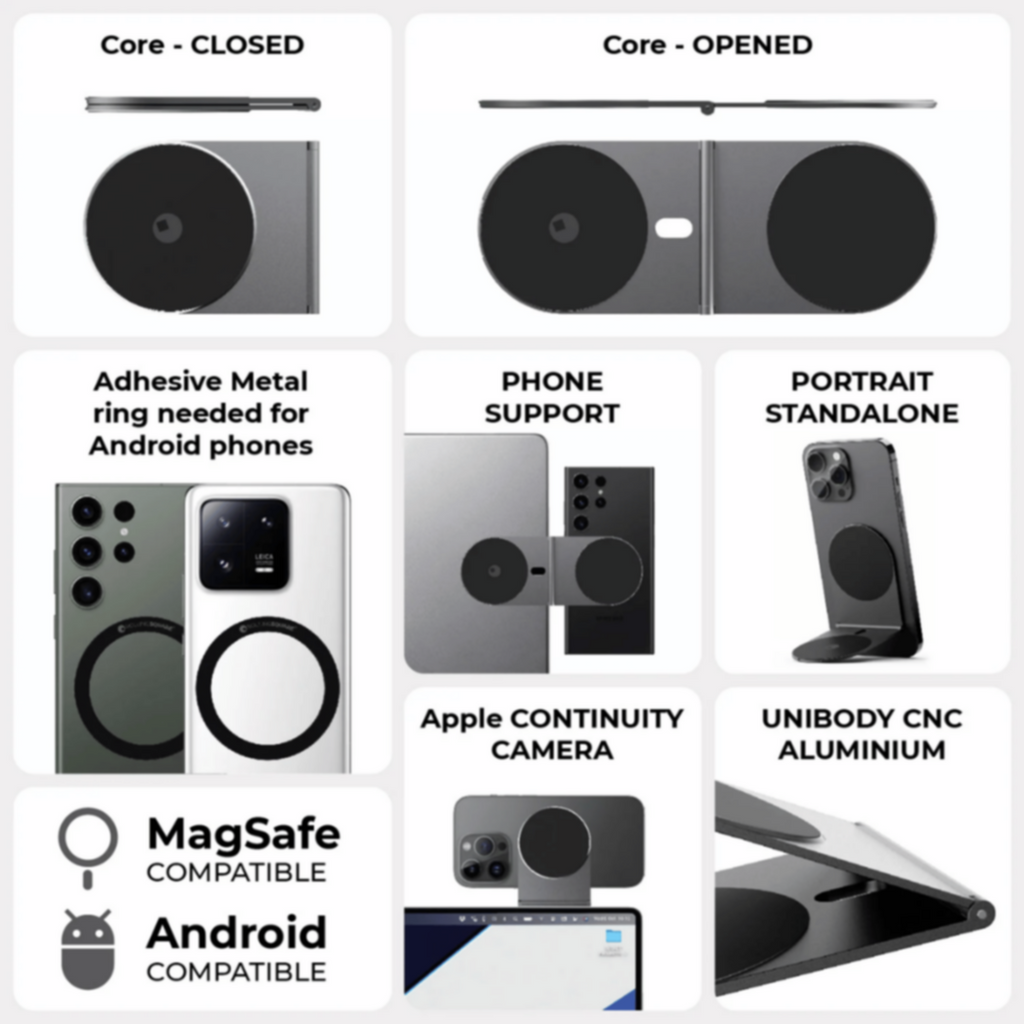 • EDGE Pro Core: EDGE Pro Core is the basic component of the ecosystem, but it's not anymore just a phone mount. You can now easily detach it from your laptop and keep using it in standalone mode, magnetically holding your iPhone, Android phone and even a tablet!. EDGE Pro Core can attach to the EDGE Pro Wireless Charger and EDGE Pro Light, giving you also the chance to adjust the inclination of any module or device it will be combined with, both in portrait and landscape mode! With its ultra thin 2.5mm / 0.1in profile, it will become the essential tool to improve the management of your tasks, also giving you the possibility to benefit of exclusive features like Apple Continuity Camera (MacBook + iPhone) and Apple Sidecar (MacBook + iPad). Two EDGE Pro Cores needed for tablet support. Magnetic rings and discs included for any non MagSafe device.