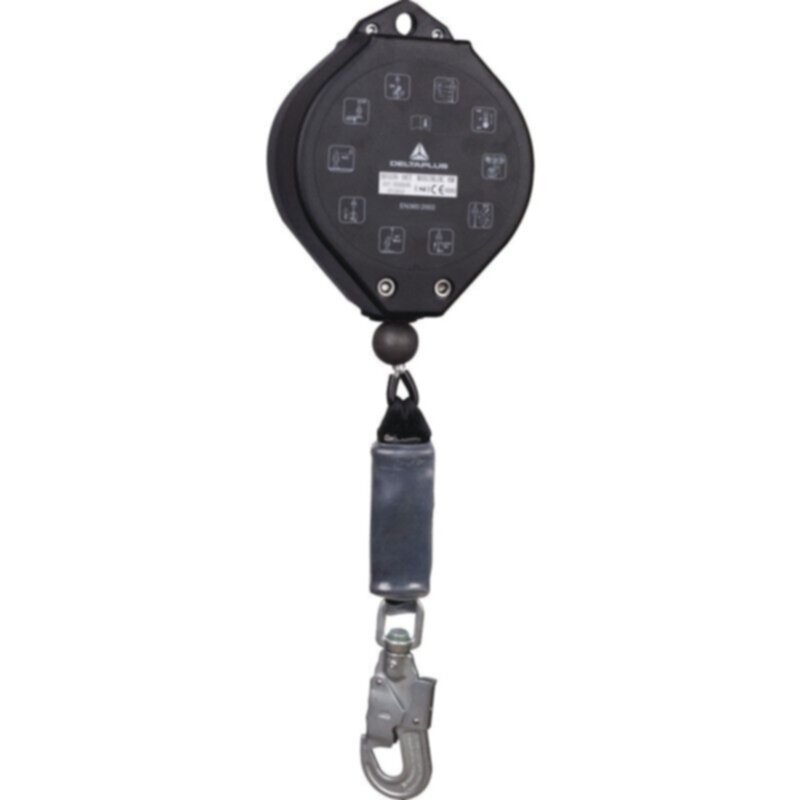 Self retractable fall arrester with Ø 4 mm galvanised steel cable with integrated energy absorber. ABS case. Fall indicator.