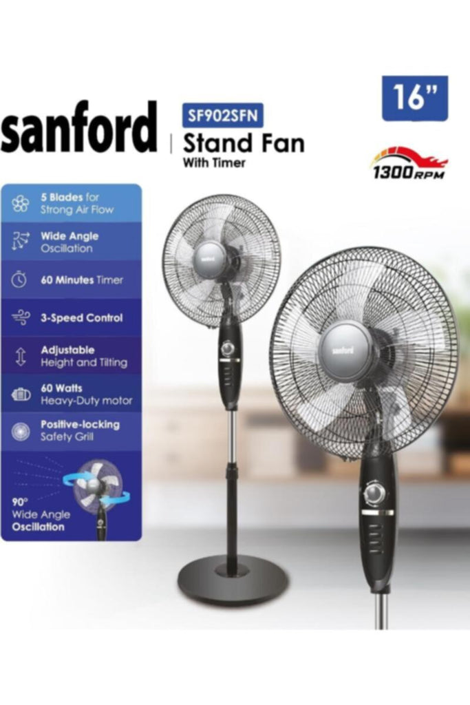 Cool an entire room with the Sanford stand fan as it provides users with 180 degree oscillation. 16inch stand fan. 3 speeds control which are normal, natural and sleep mode. 180 degree manual oscillation. Powerful motor, Strong base, Power: 60 Watts Adjustable height and tilt head. 60 minutes timer, Easy to clean and maintain. Strong Safety Grill For Children s Protection