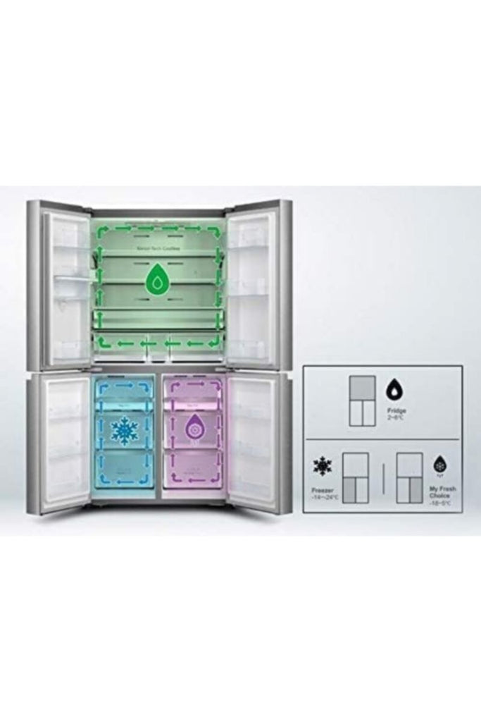 | Door Hinges | Left Digital Control Panel with Multi Program Cooling Functions. Six Heavy Duty Drawers And Three Shelves For Better And Wide Storage.Extra adjustable Shelves in Door for More Storage. Frost Free Freezer Technology With Super Freeze Function And Long Lasting Cooling. Light Inside the cabin. Large capacity Comes with 412 liters of Gross capacity to store a variety of items in different shelves and drawers. It has net ESMA Capacity of 216 Liter. This fridge freezer is fully adaptable to your needs. It has three different compartments with flexible temperatures fridge, freezer, and My Fresh Choice section, each with their own controls. You can set the fridge and the freezer to whatever temperature suits you most. French Door Refrigerator Are Ideal For Large Apartments And Families. Made From Good Quality Material That Makes It Durable, Long Lasting And Trouble Free. It Features Spacious Cooling Compartments And Storage Spaces To Keep Food And Beverages In An Organized Manner And At The Same Time Keeping It Fresh.My Fresh Choice zone can be easily convertedfrom fridge to freezer with temperature settings going from 18 C all the wayto +5 C, depending on what you want to store at that moment. By setting thetemperature you need, you create a perfect environment for your food,efficiently prolonging its freshness and taste. There's Always A Place For Fresh And Frozen Favorites Inside With Hisense Refrigerator. Finding Food Is Easy Thanks To Energy Efficient And Tropical Compressor, With Electronic Temperature Controls Help You Store More, So There Will Always Be Room For What You Want, Where You Want It.Brand Warranty 1 Year Full and 10 Years Compressor. • Store and see more • Adjustable glass shelf • Easy to store bigger • Triple choice • Huge space and higher height (220 mm • Easy glide drawers • Energy saving & high efficiency • Door alarm function • Supper cooling function |