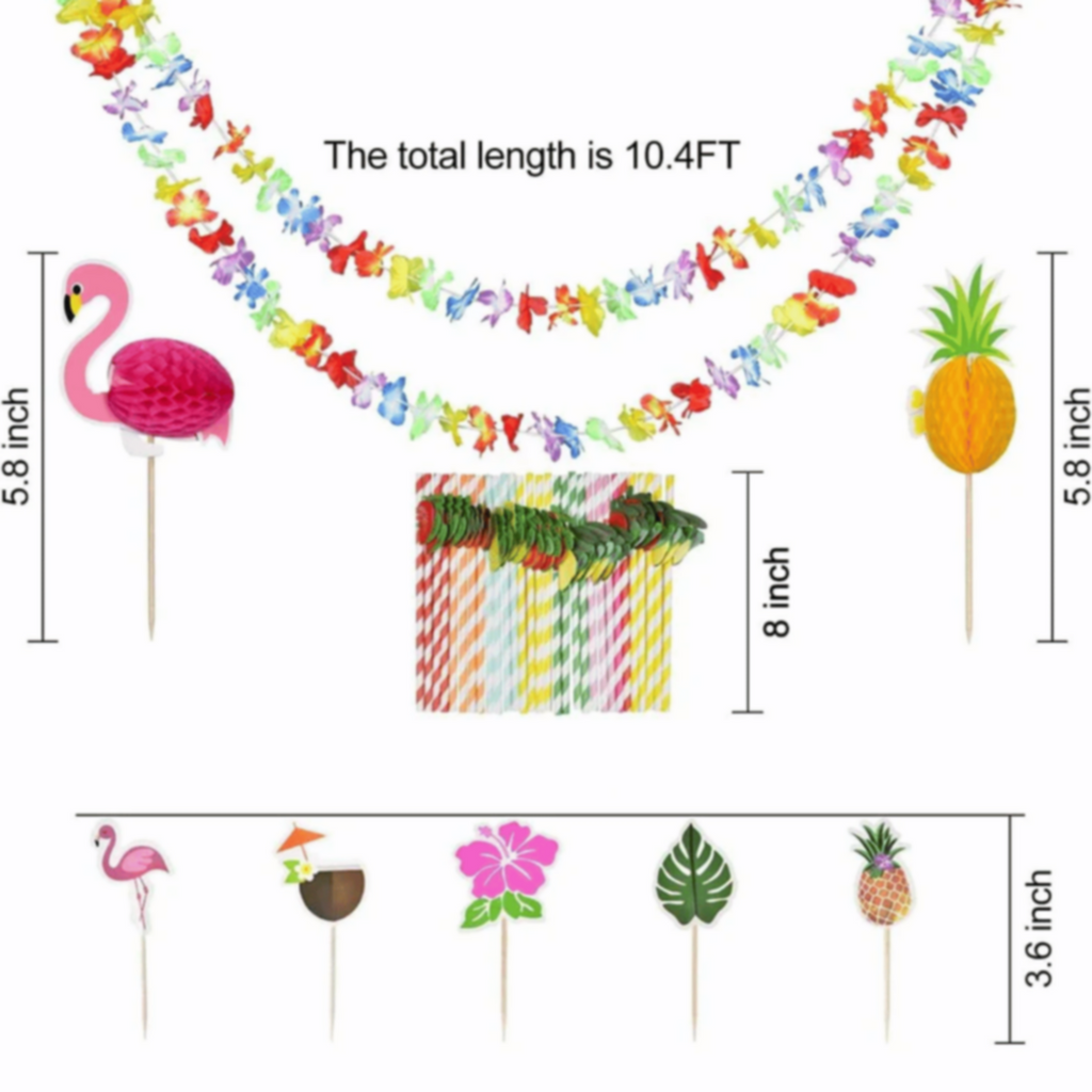 • Set Includes: 1pcs x Hawaiian Luau Table Skirt, 30pcs x Silk Hibiscus Flowers, 30pcs x Multicolored Umbrellas, 25pcs x Artificial Palm Leaves, 2pcs x Luau Garland, 32pcs x Multicolored Straw Pack, 11pcs x Pink & Red Flammant Cake/Cupcake D cor, 7pcs x Pineapple Cake/Cupcake D cor, 4pcs x Hibiscus Flower Cake/Cupcake D cor, 4pcs x Leaf Cake/Cupcake D cor, 4pcs x Dessert Cake/Cupcake D cor