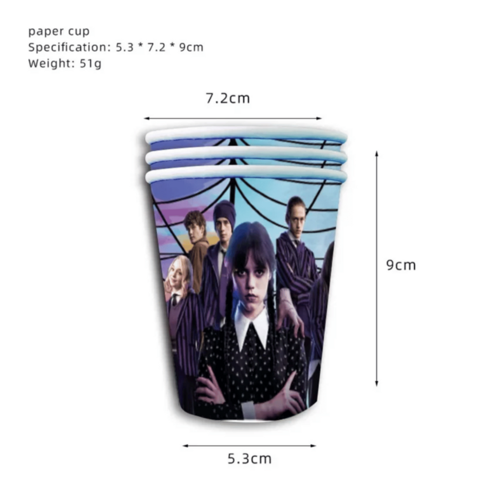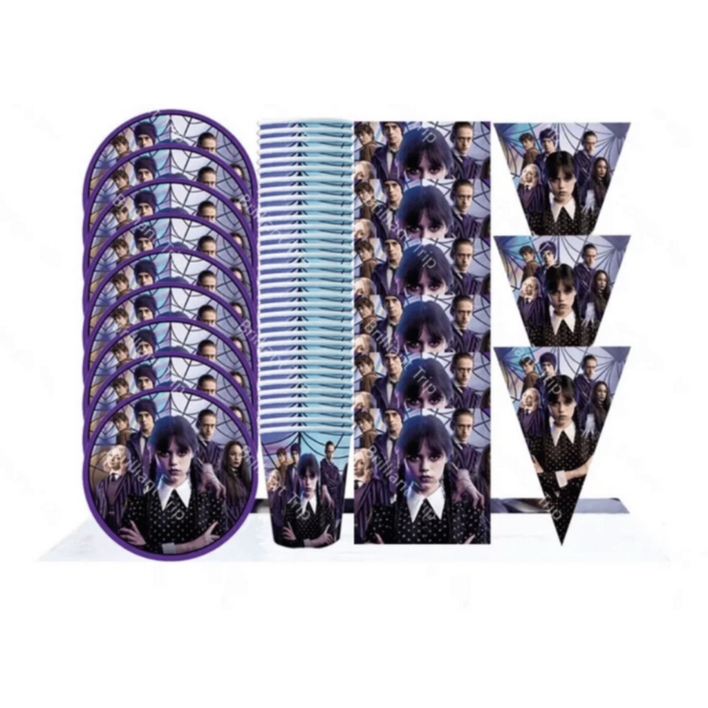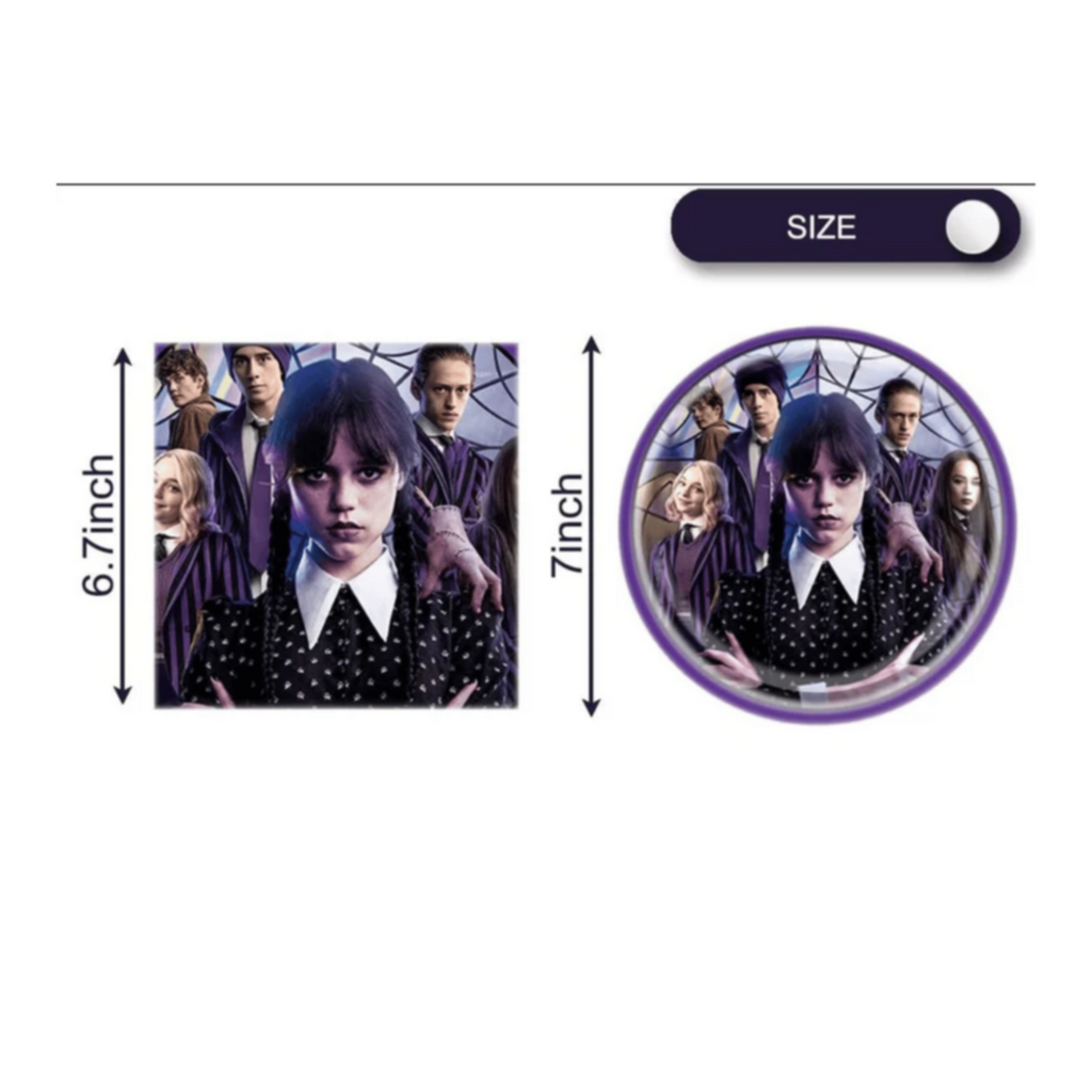• Wednesday birthday party set includes: 20 Pcs x 7'' Wednesday Themed Dessert Plates, 20 Pcs x Napkins, 20 Pcs x Party Cups, 1 Set x Banner