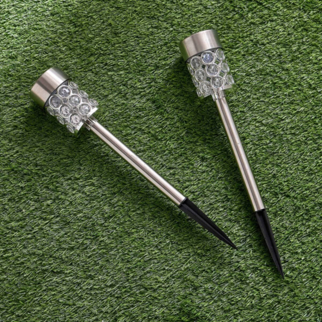 Illuminate your outdoor space with this set of two solar powered spike lights. Each light features a modern design with a sleek aluminium finish. They are perfect for adding a touch of light and style to your garden, patio, or driveway.The product images have props used for illustrative purposes.