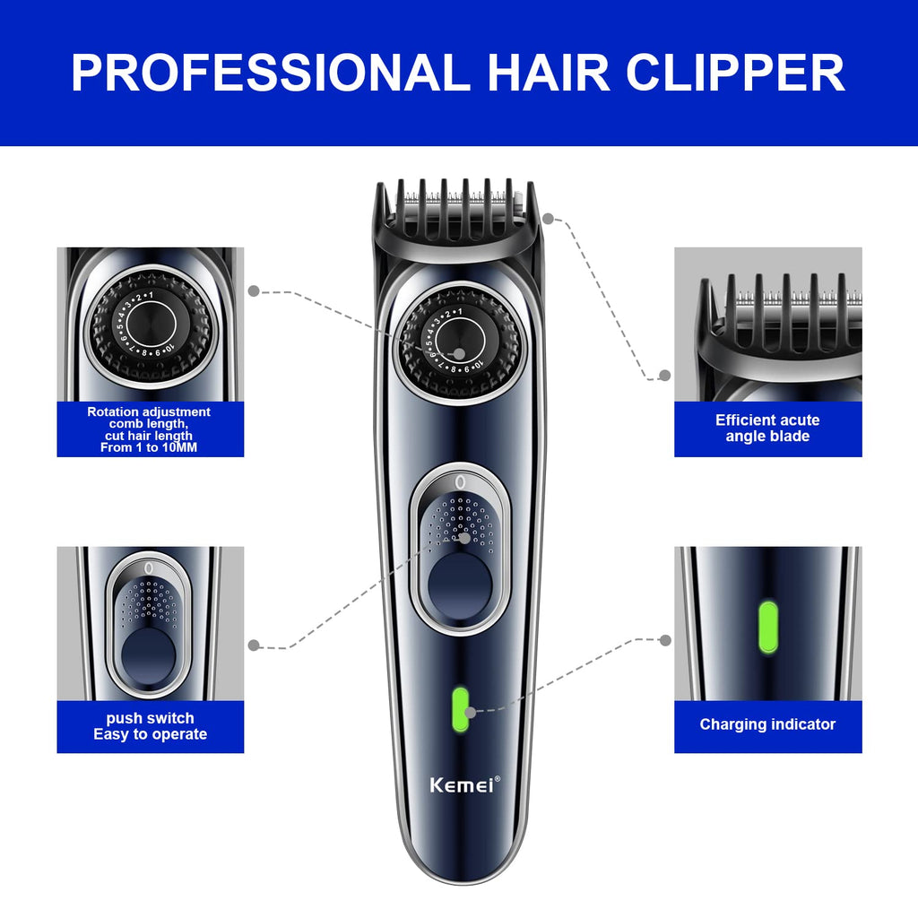 The Kemei KM 1256 is a versatile cordless hair clipper designed for both personal grooming and basic barber style cuts. It features a USB rechargeable battery, adjustable cutting lengths, and durable stainless steel construction, making it a practical choice for home or travel use.
