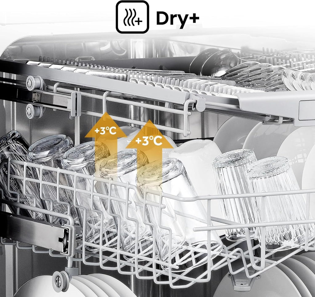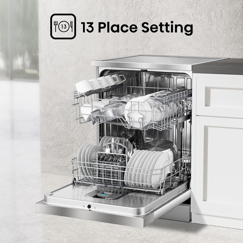 13 place settings, 2 baskets, 8 Programs: 3 additional functions: Half load, Dry+, 3 in 1, Self Clean, Child Lock, Flexible Cutlery Basket, Tub & filter: Stainless Steel, Water Overflow Protection, Water consumption: 11L, Noise level: 49dB, Control: Push button, Stainless steel, H W-D 850*600*600 mm